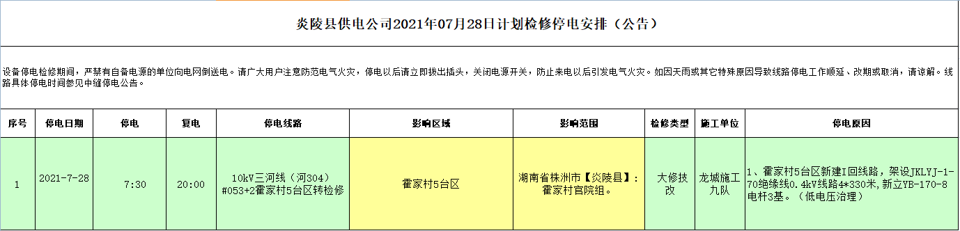 炎陵县供电公司2021年07月28日计划检修停电安排(公告)
