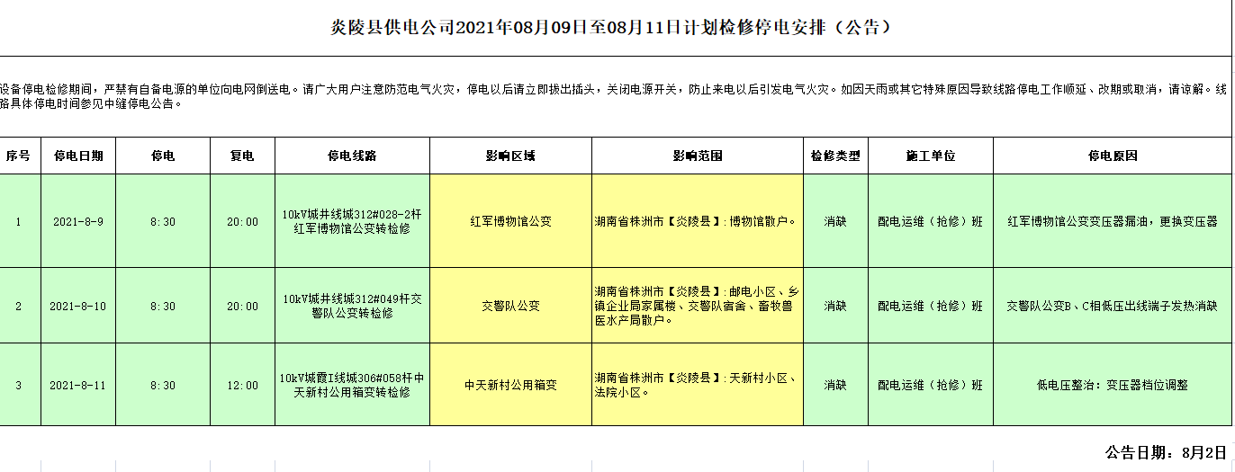 炎陵县供电公司2021年08月09日至08月11日计划检修停电安排(公告)