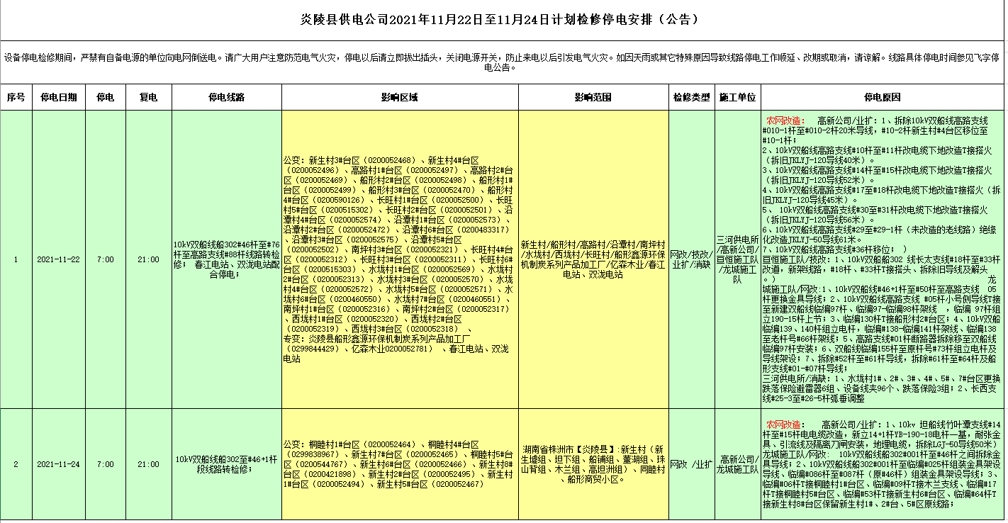 炎陵县供电公司2021年11月22日至11月24日计划检修停电安排(公告)