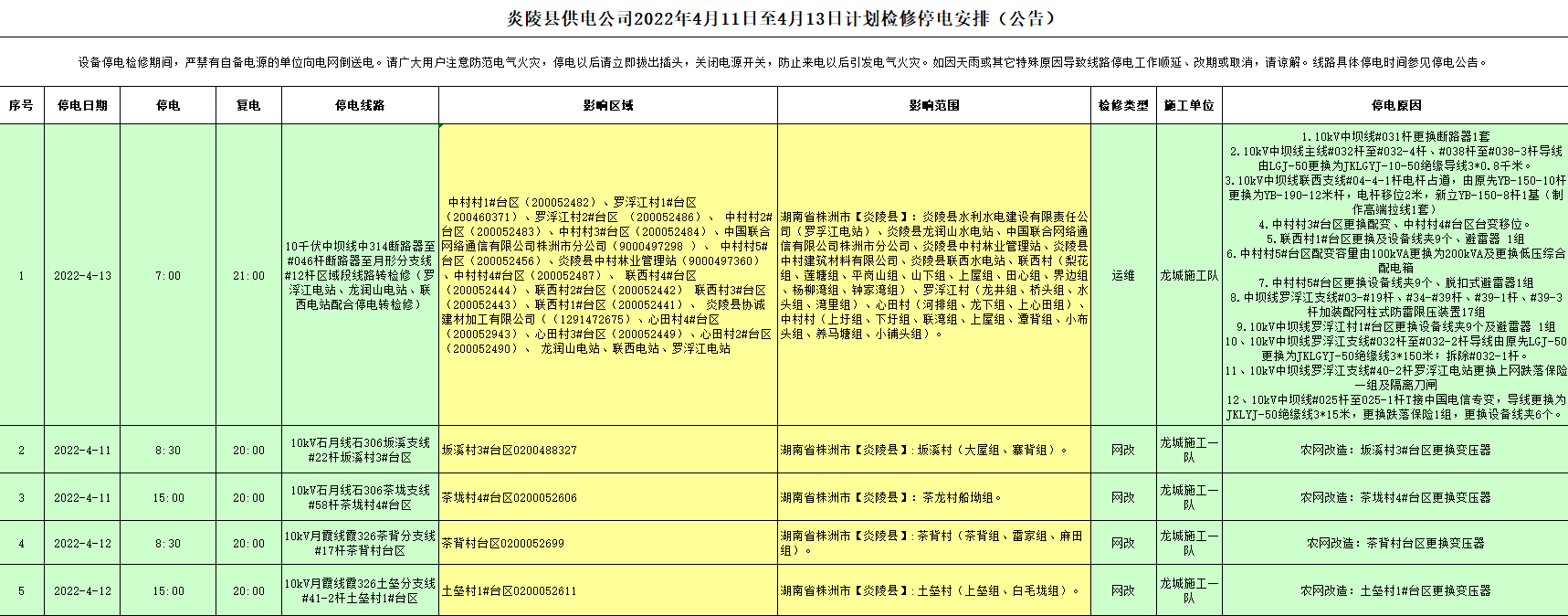 炎陵县供电公司2022年4月11日至4月13日计划检修停电安排(公告)