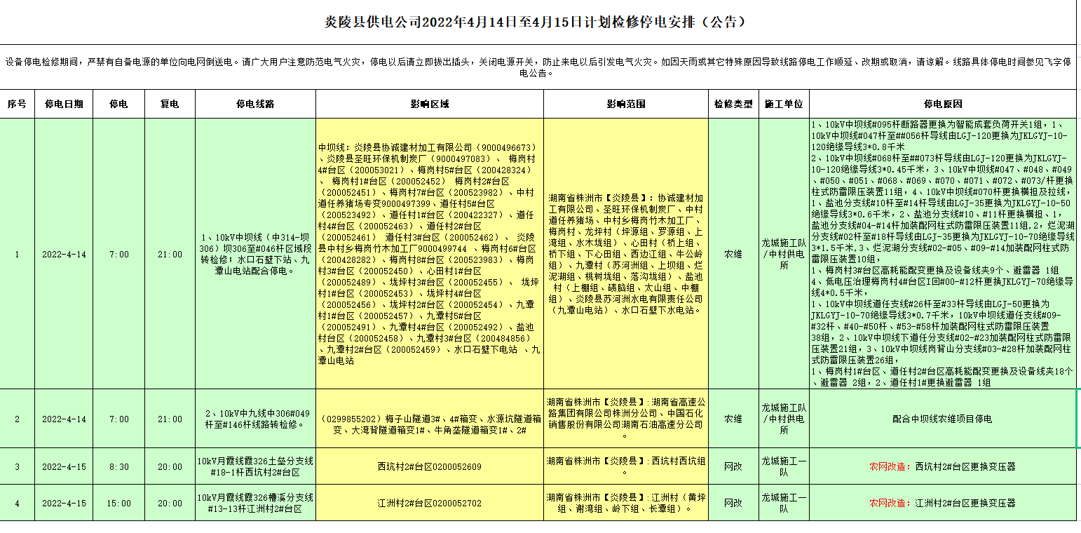 炎陵县供电公司2022年4月14日至4月15日计划检修停电安排(公告)
