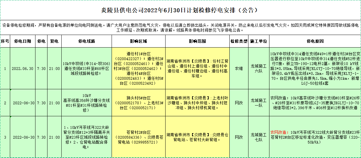 炎陵县供电公司2022年6月30日计划检修停电安排(公告)