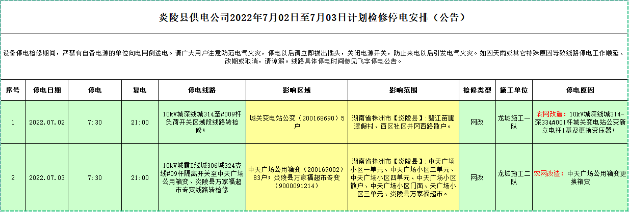 炎陵县供电公司2022年7月02日至7月03日计划检修停电安排(公告)