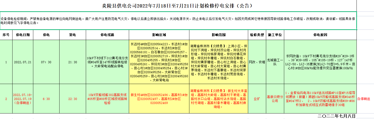 炎陵县供电公司2022年7月18日至7月21日计划检修停电安排(公告)