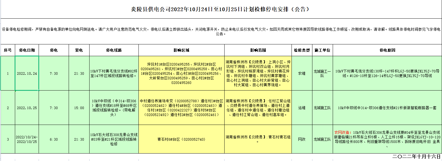 炎陵县供电公司2022年10月24日至10月25日计划检修停电安排(公告)