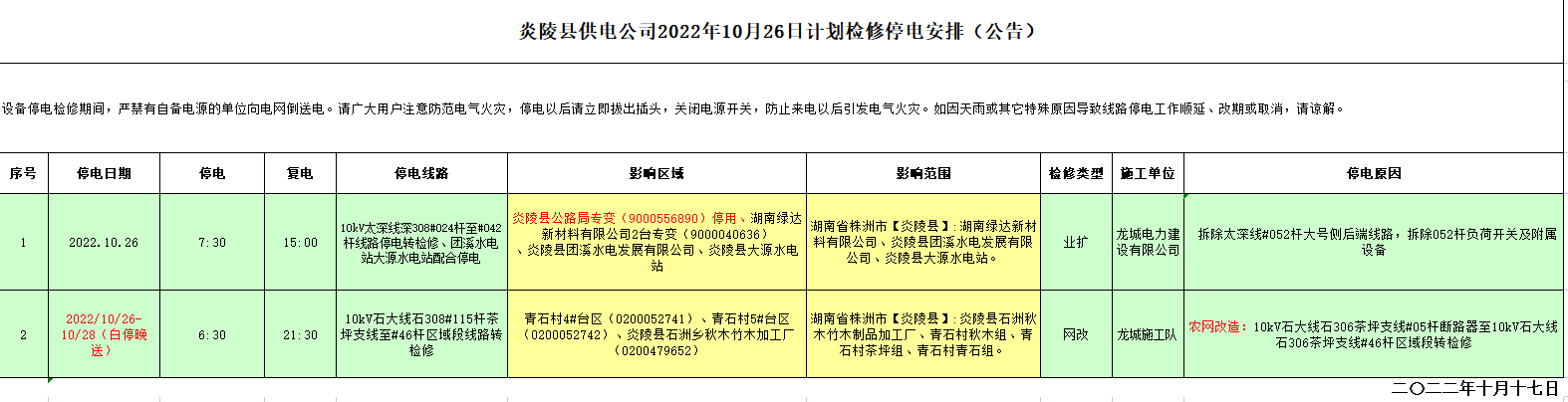 炎陵县供电公司2022年10月26日计划检修停电安排(公告)