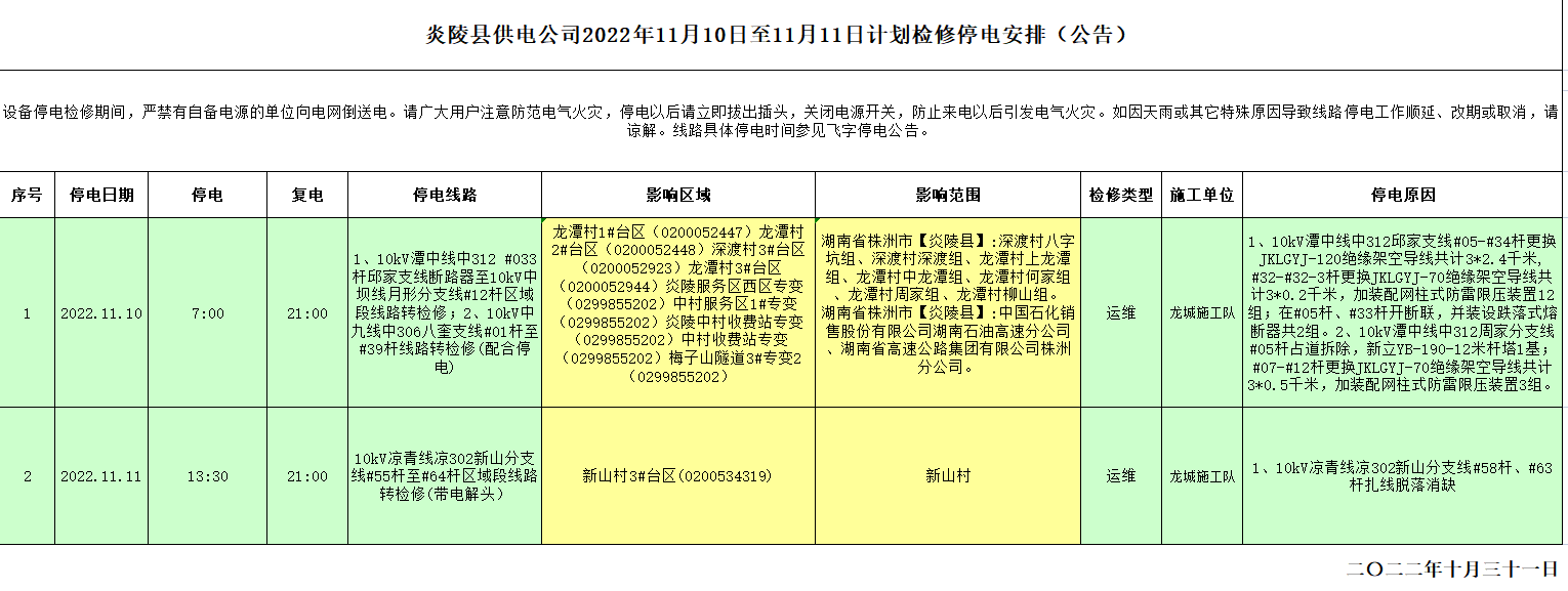 炎陵县供电公司2022年11月10日至11月11日计划检修停电安排(公告)