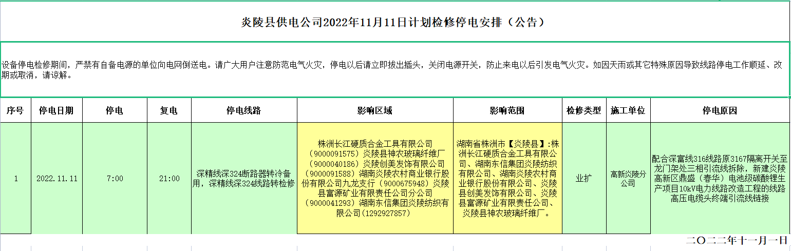 炎陵县供电公司2022年11月11日计划检修停电安排(公告)