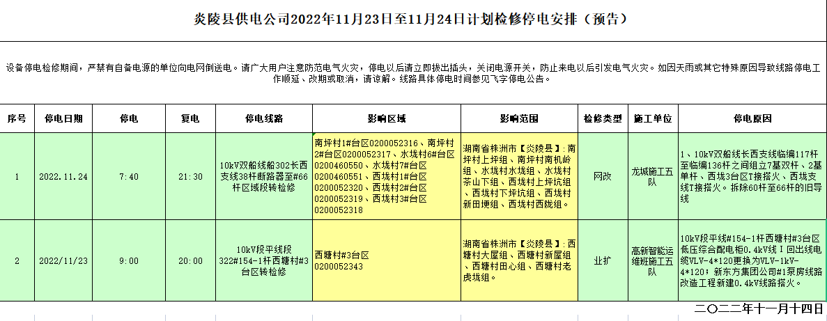 炎陵县供电公司2022年11月23日至11月24日计划检修停电安排(预告)
