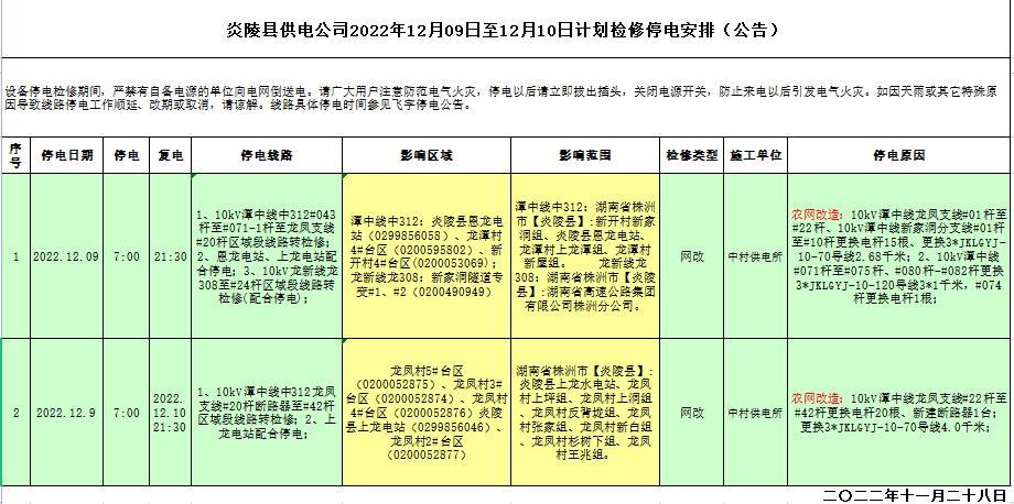 炎陵县供电公司2022年12月09日至12月10日计划检修停电安排(公告)
