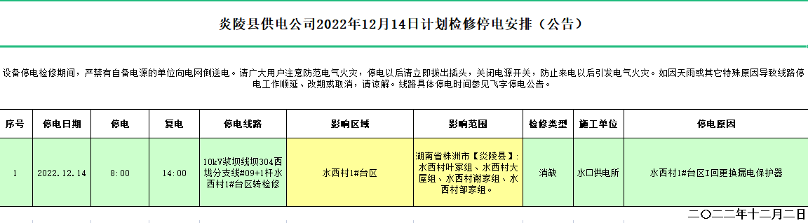 炎陵县供电公司2022年12月14日计划检修停电安排(公告)