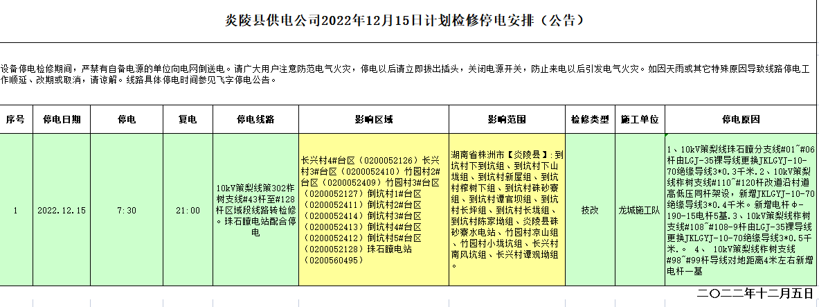 炎陵县供电公司2022年12月15日计划检修停电安排(公告)