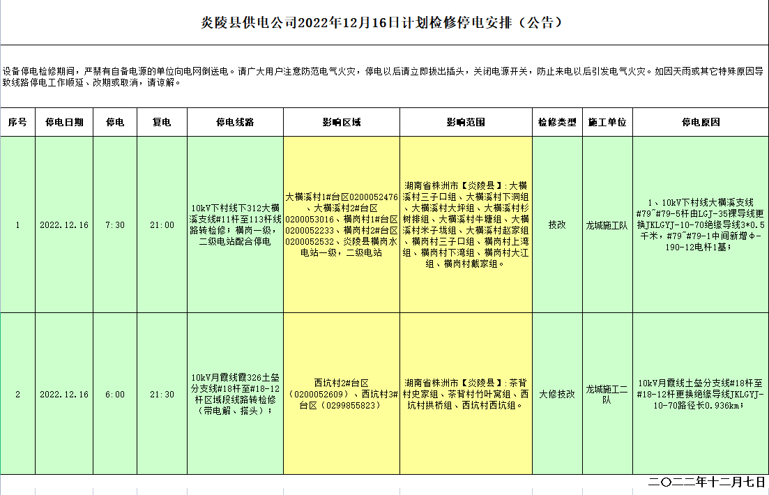 炎陵县供电公司2022年12月16日计划检修停电安排(公告)
