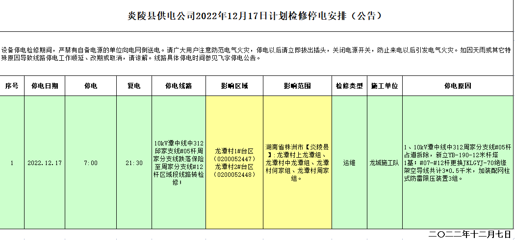 炎陵县供电公司2022年12月17日计划检修停电安排(公告)