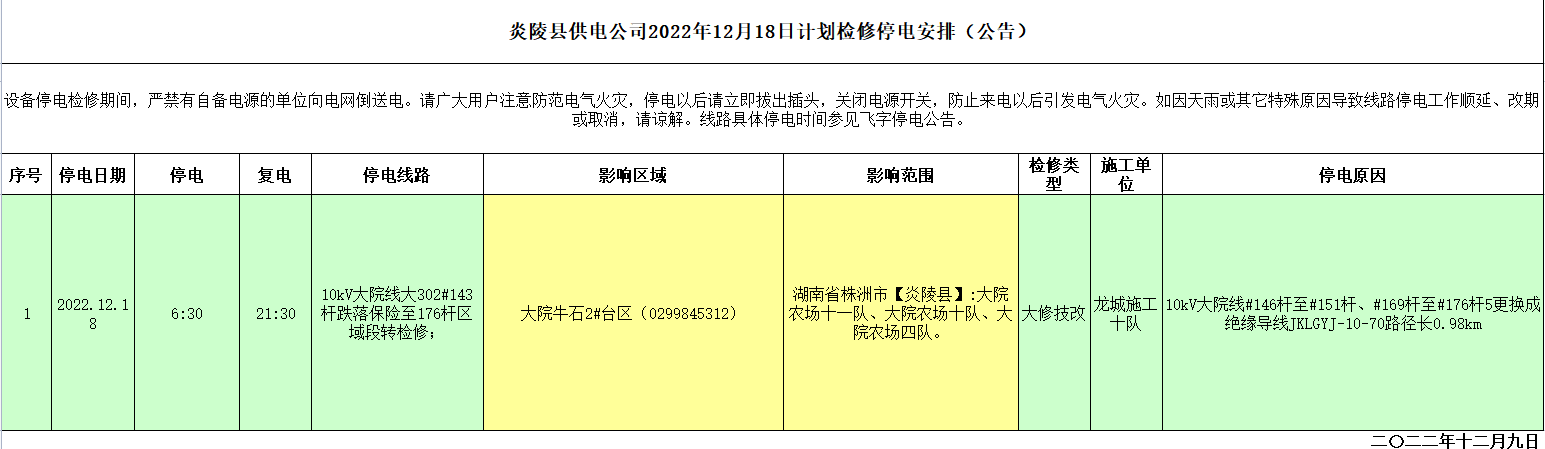炎陵县供电公司2022年12月18日计划检修停电安排(公告)