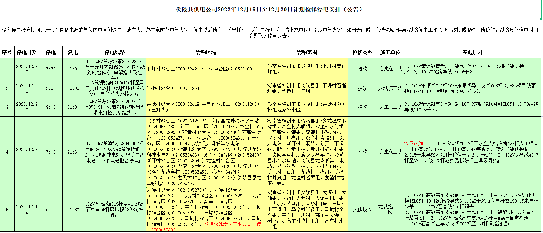 炎陵县供电公司2022年12月19日至12月20日计划检修停电安排(公告)