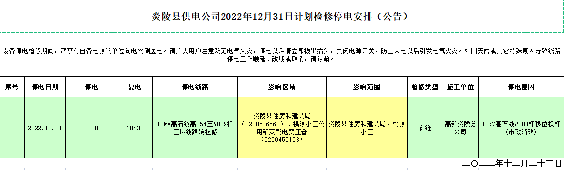炎陵县供电公司2022年12月31日计划检修停电安排(公告)