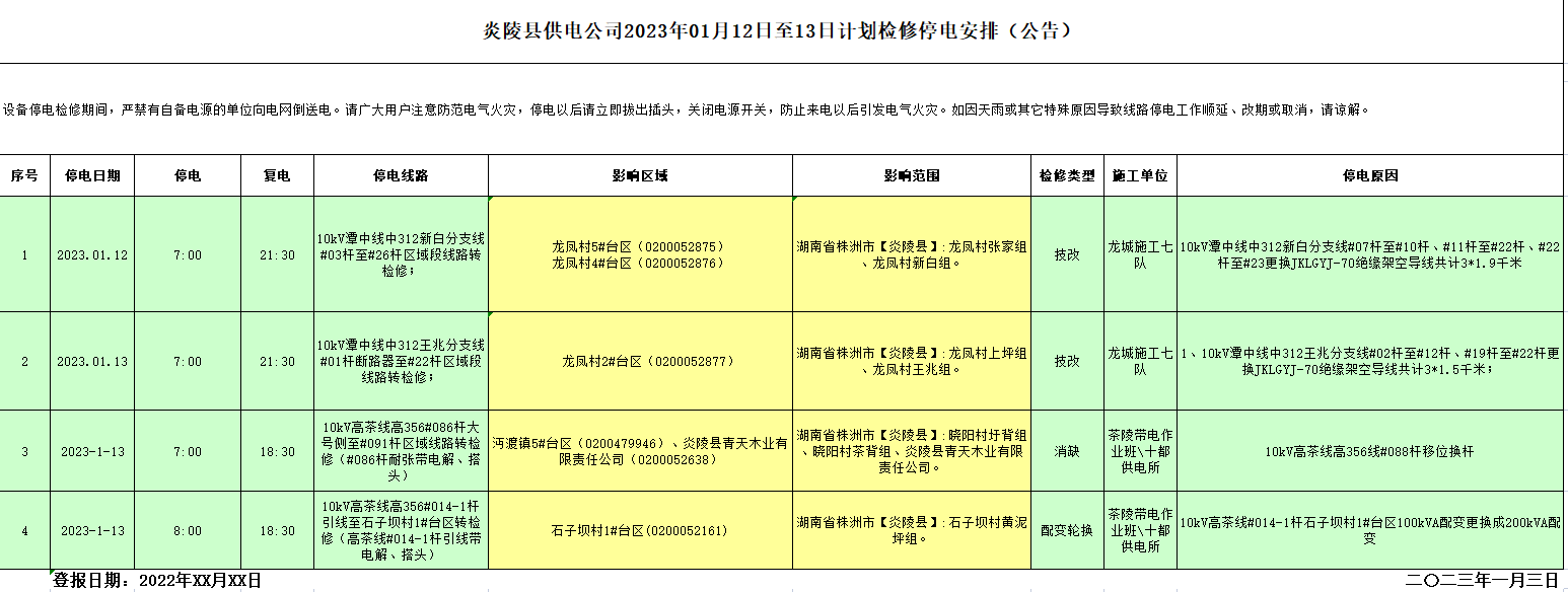 炎陵县供电公司2023年01月12日至13日计划检修停电安排(公告)