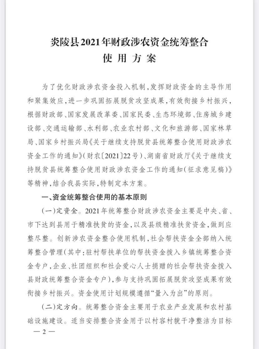 关于印发《炎陵县2021年财政涉农资金统筹整合使用方案》的通知