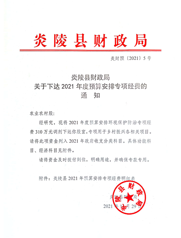 炎陵县财政局关于下达2021年度预算安排专项经费的通知