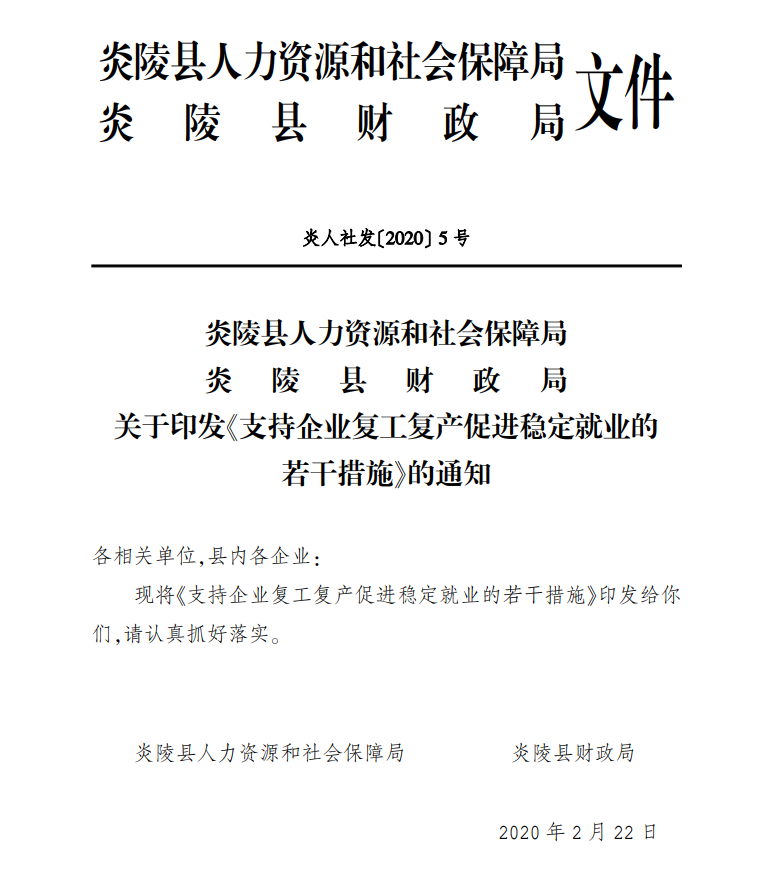 文件下载:炎陵县人社局惠企政策—炎人社发〔2020〕5号支持企业复工复产促进稳定就业的若干措施