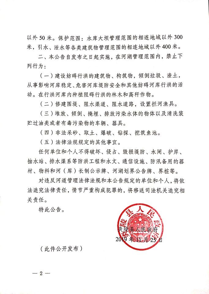 索引号:412500/2019-10255 发文日期:2019-11-25 成文日期:2019-11-25 文号:炎政告〔2019〕23号 有效期至:2022-11-25 统一登记号:YLDR-2019-00009 公开范围: 面向社会 公开方式:政府网站 公开责任部门:县水利局