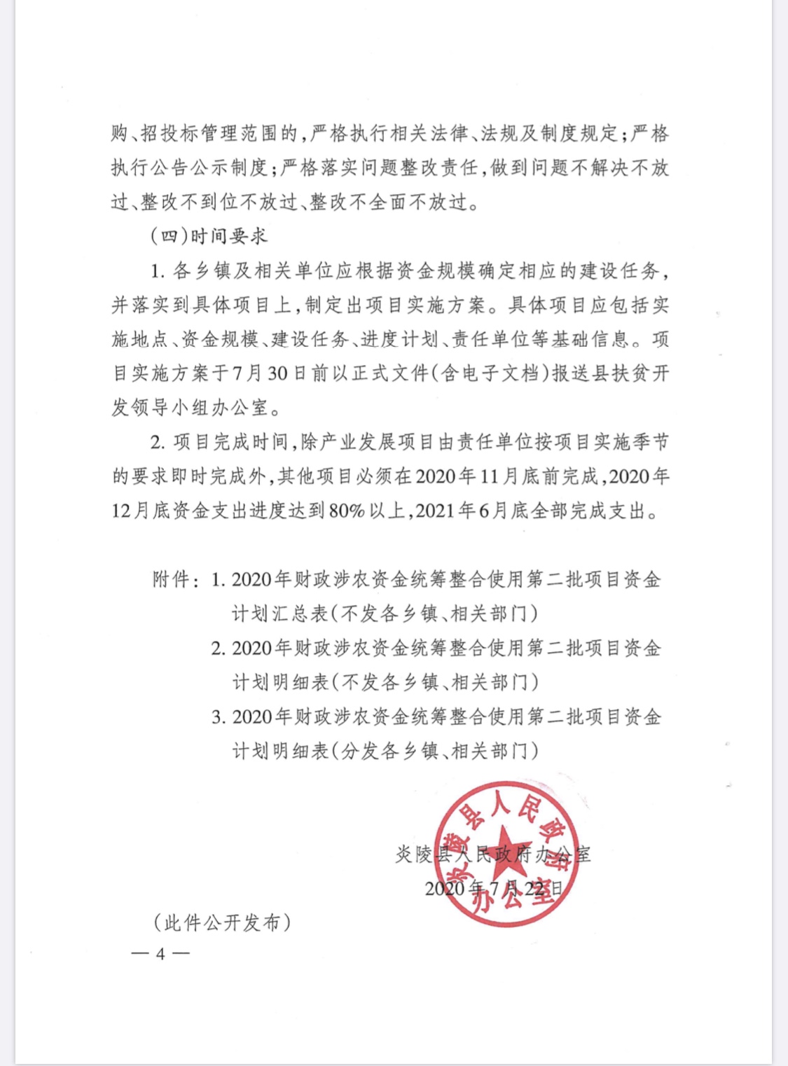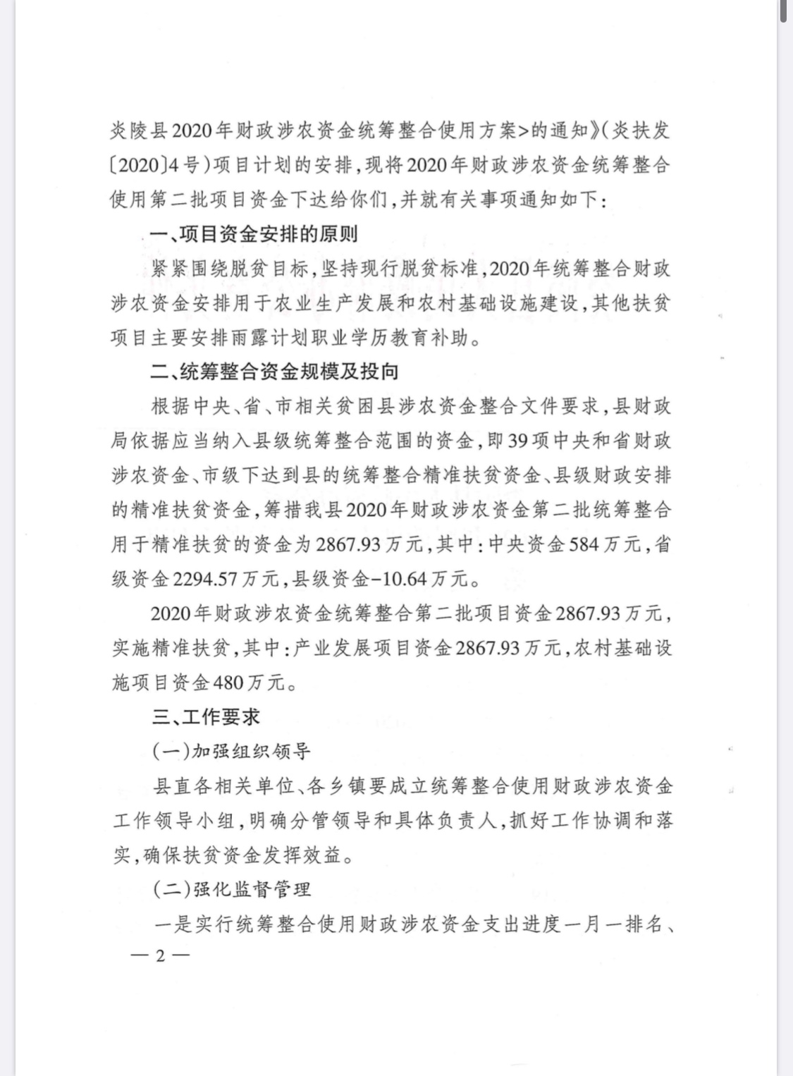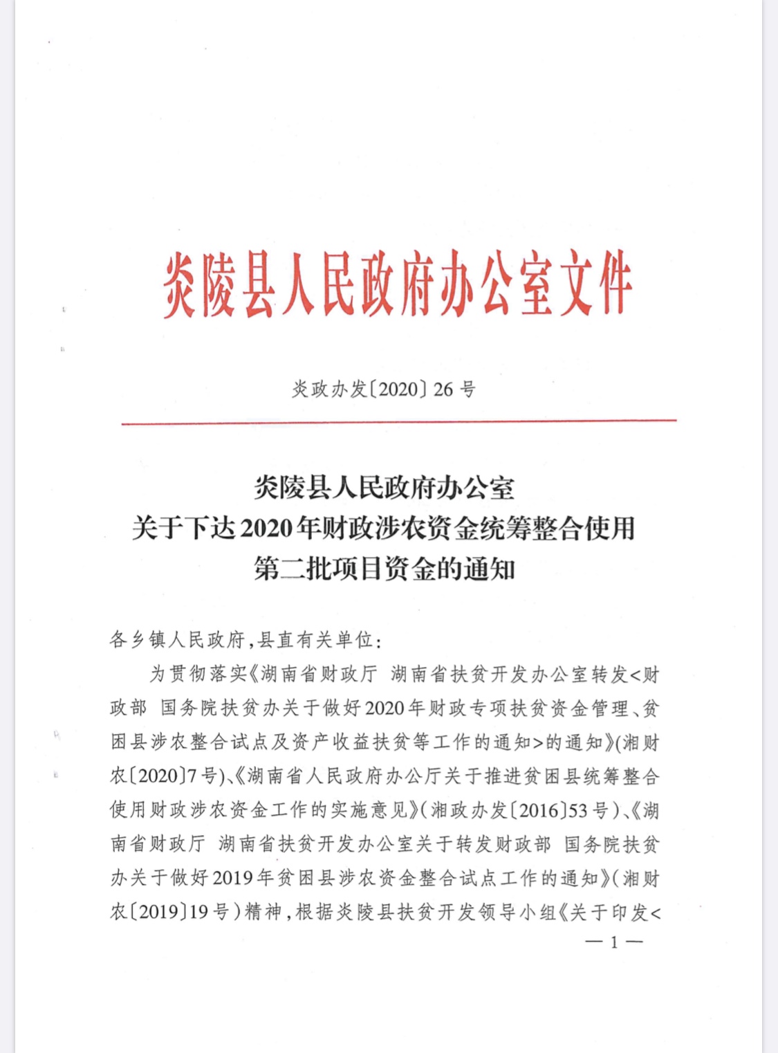 文件下载:炎陵县人民政府办公室关于下达2020年财政涉农资金统筹整合使用第二批项目资金的通知