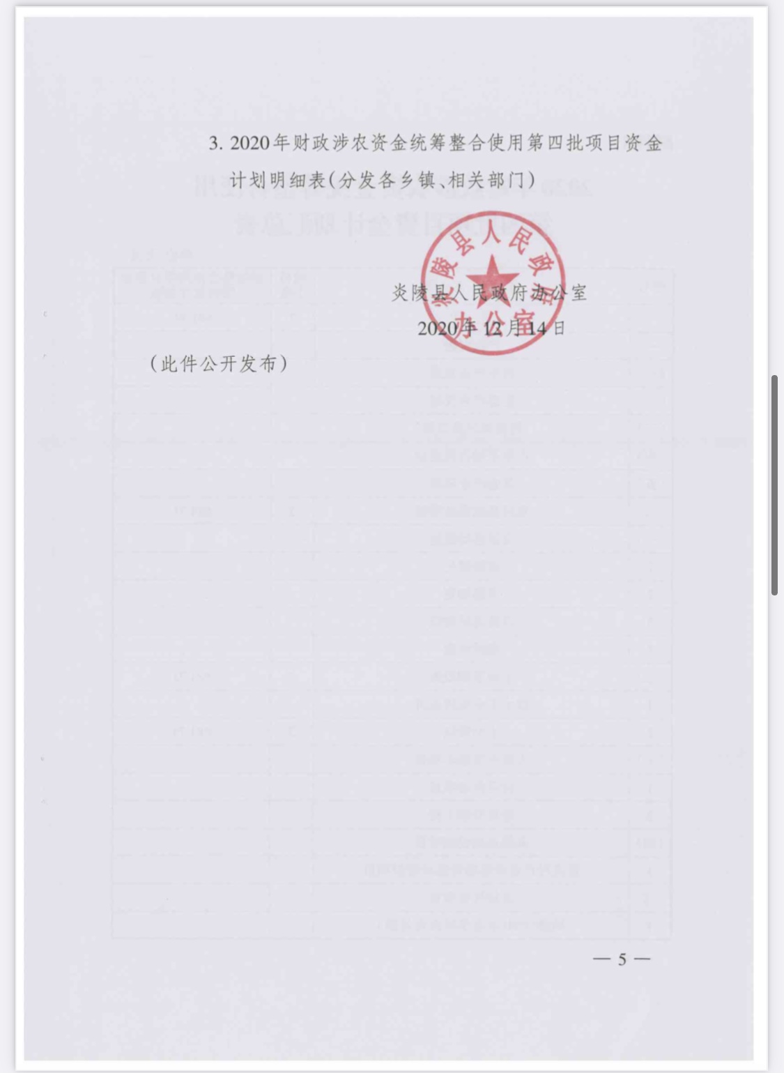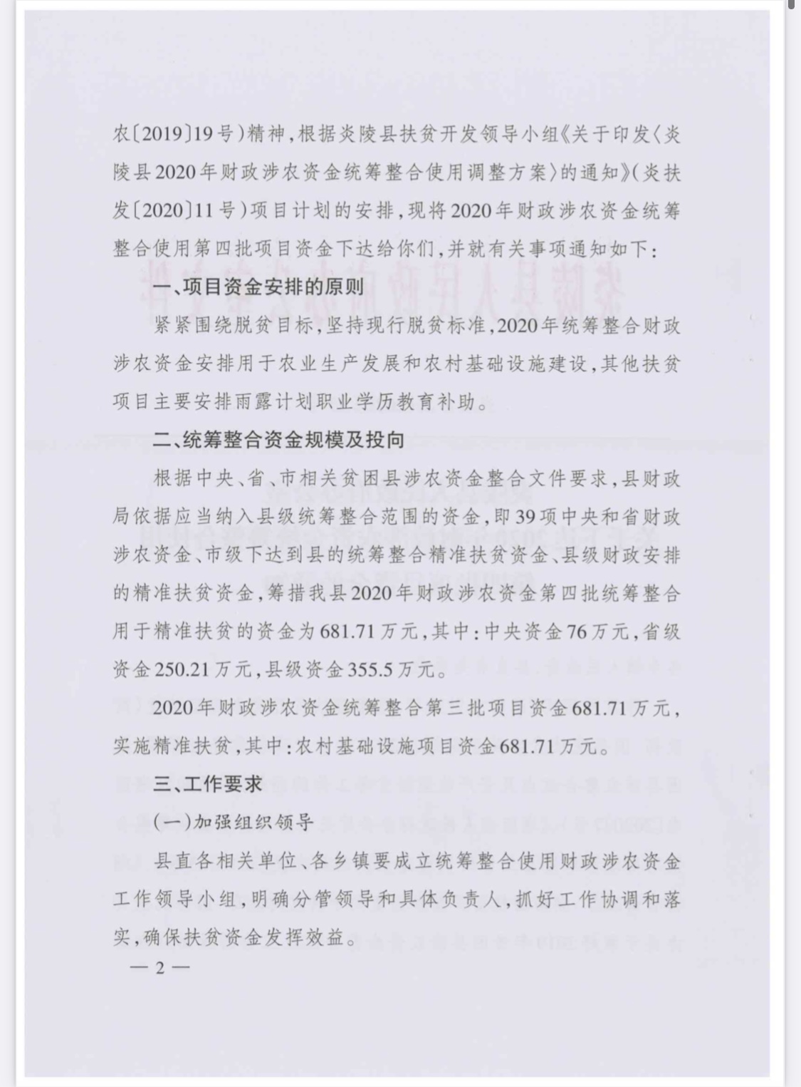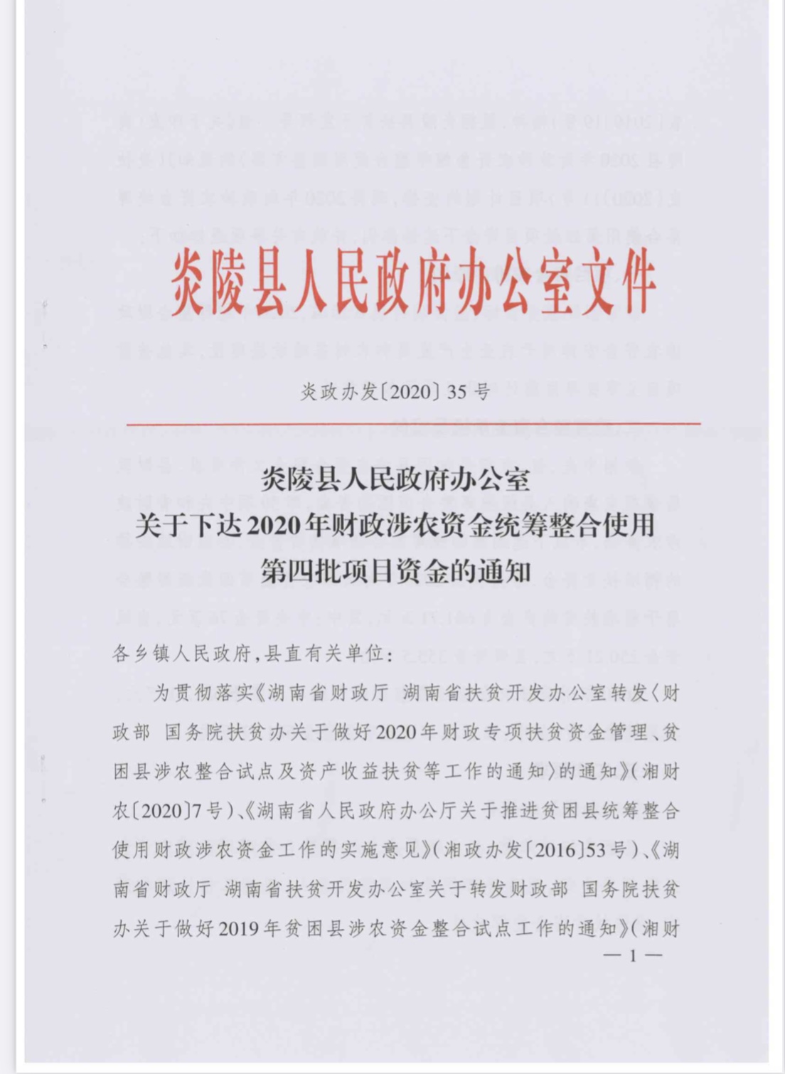 文件下载:炎政办发[2020]35号炎陵县人民政府办公室关于下达2020年财政涉农资金统筹整合使用第四批项目资金的通知