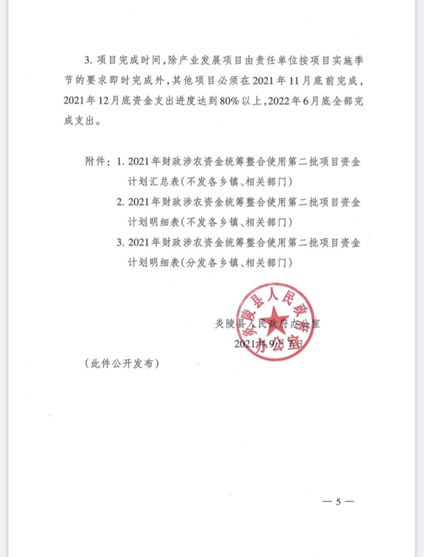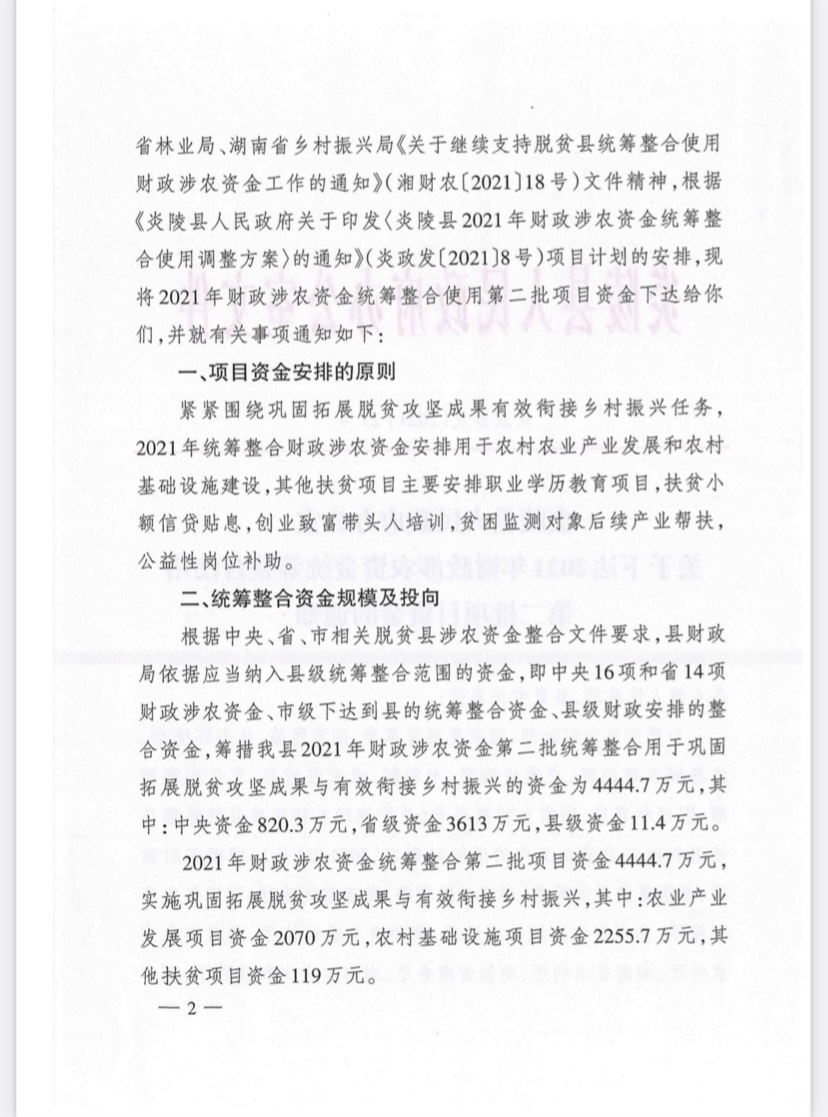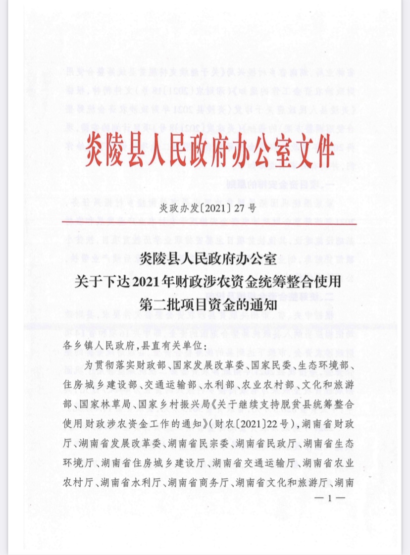 炎陵县人民政府办公室关于下达2021年财政涉农资金统筹整合使用第二批项目资金的通知