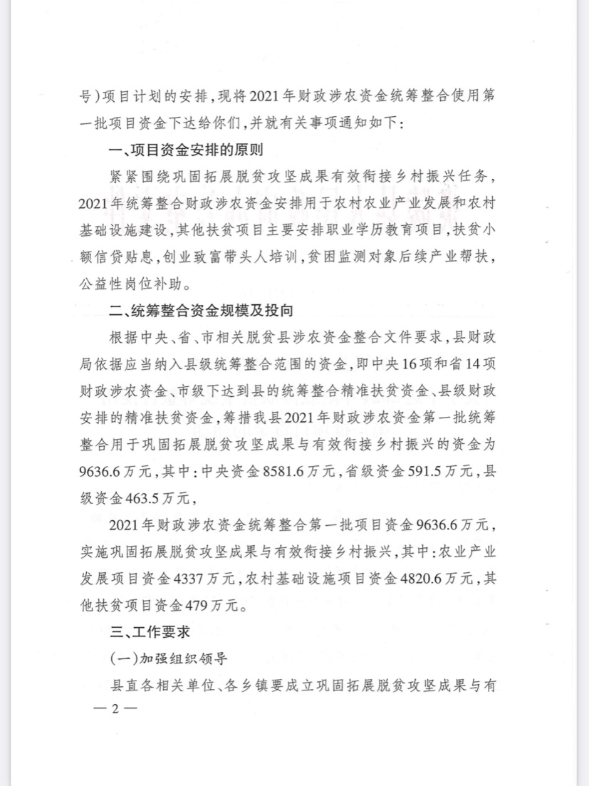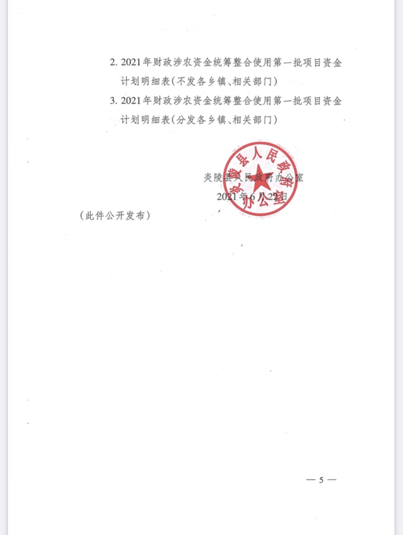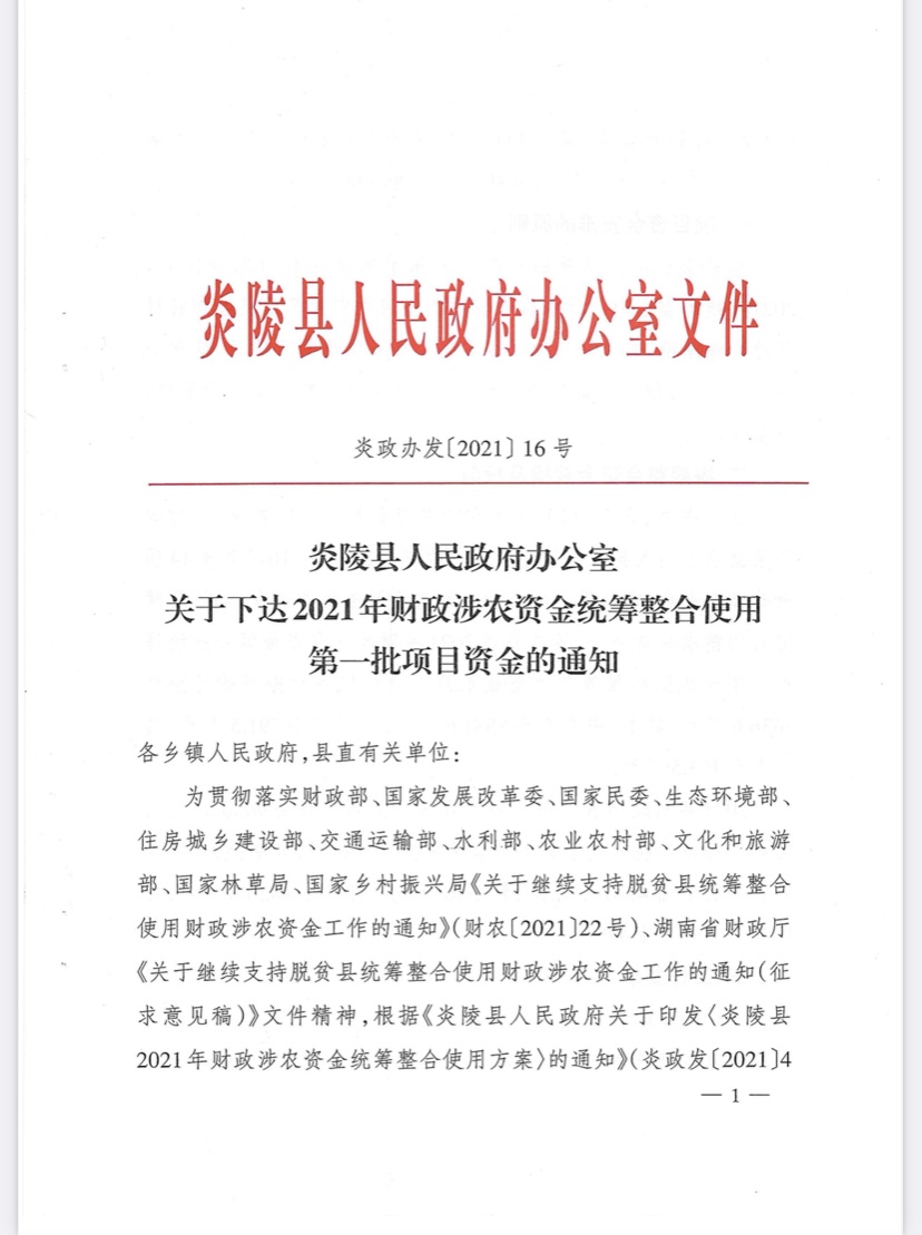 炎陵县人民政府办公室关于下达2021年财政涉农资金统筹整合使用第一批项目资金的通知