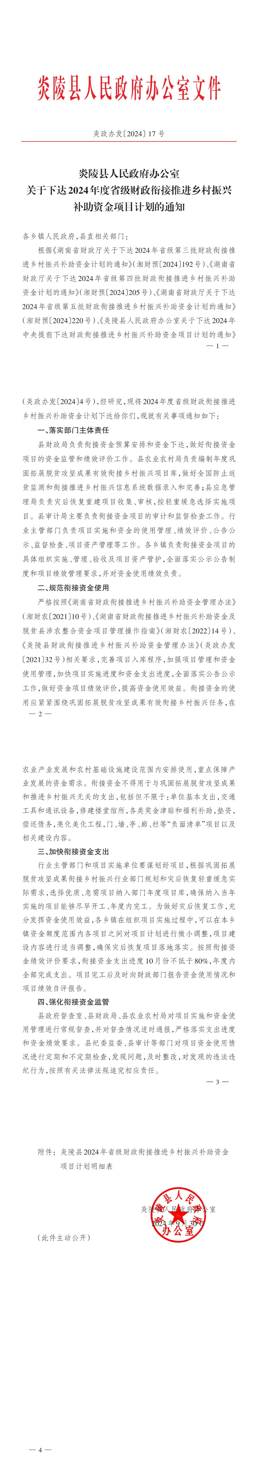 炎陵县人民政府办公室关于下达2024年度省级财政衔接推进乡村振兴补助资金项目计划的通知