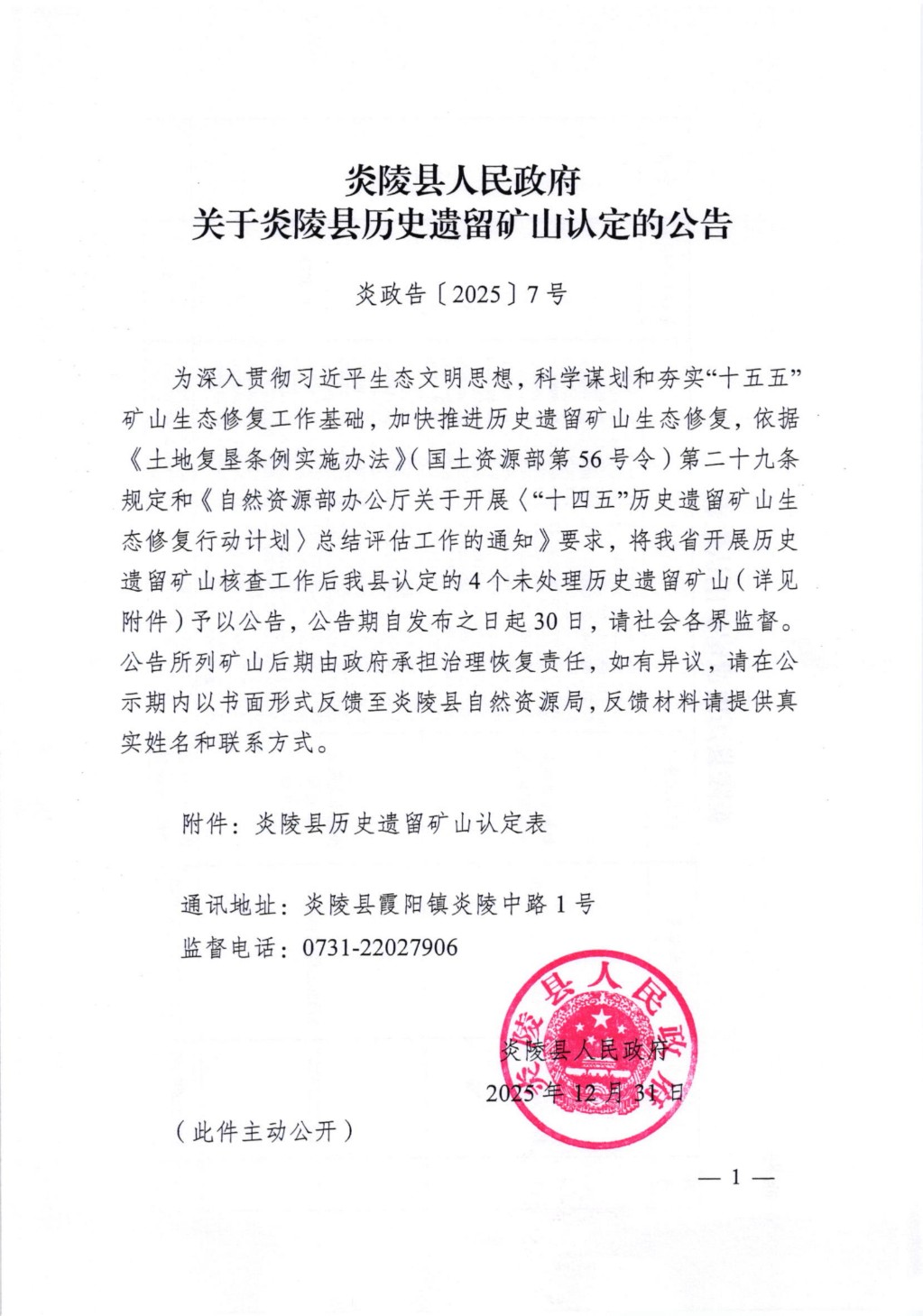 附件:关于炎陵县历史遗留矿山认定的公告