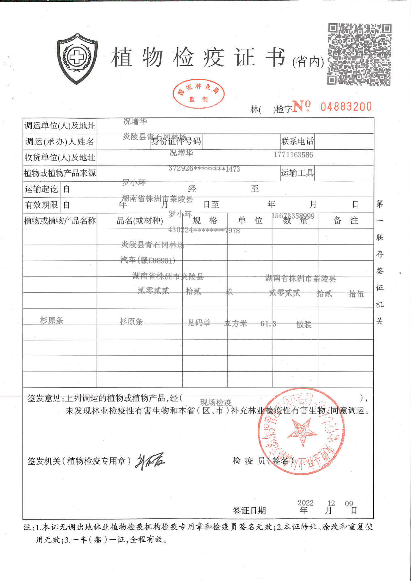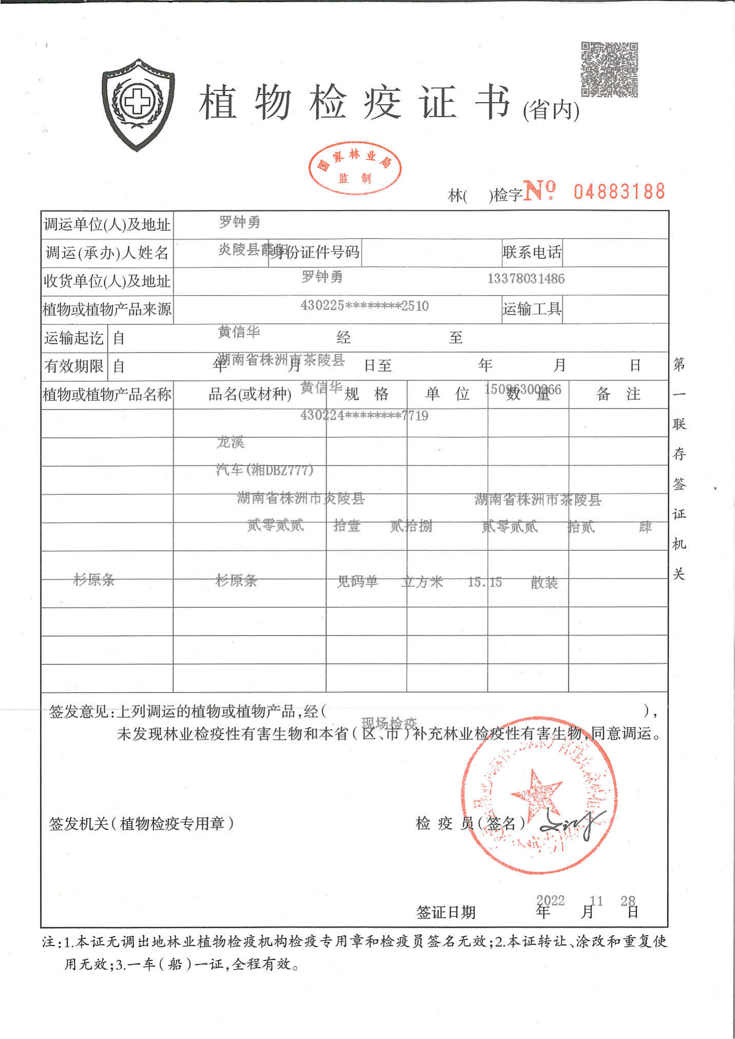 炎陵县林业局植物检疫证书林草检字:湘No 04883188,湘No 04883200