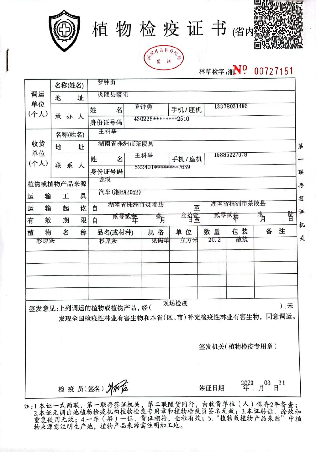 炎陵县林业局植物检疫证书林草检字:湘No 00727151