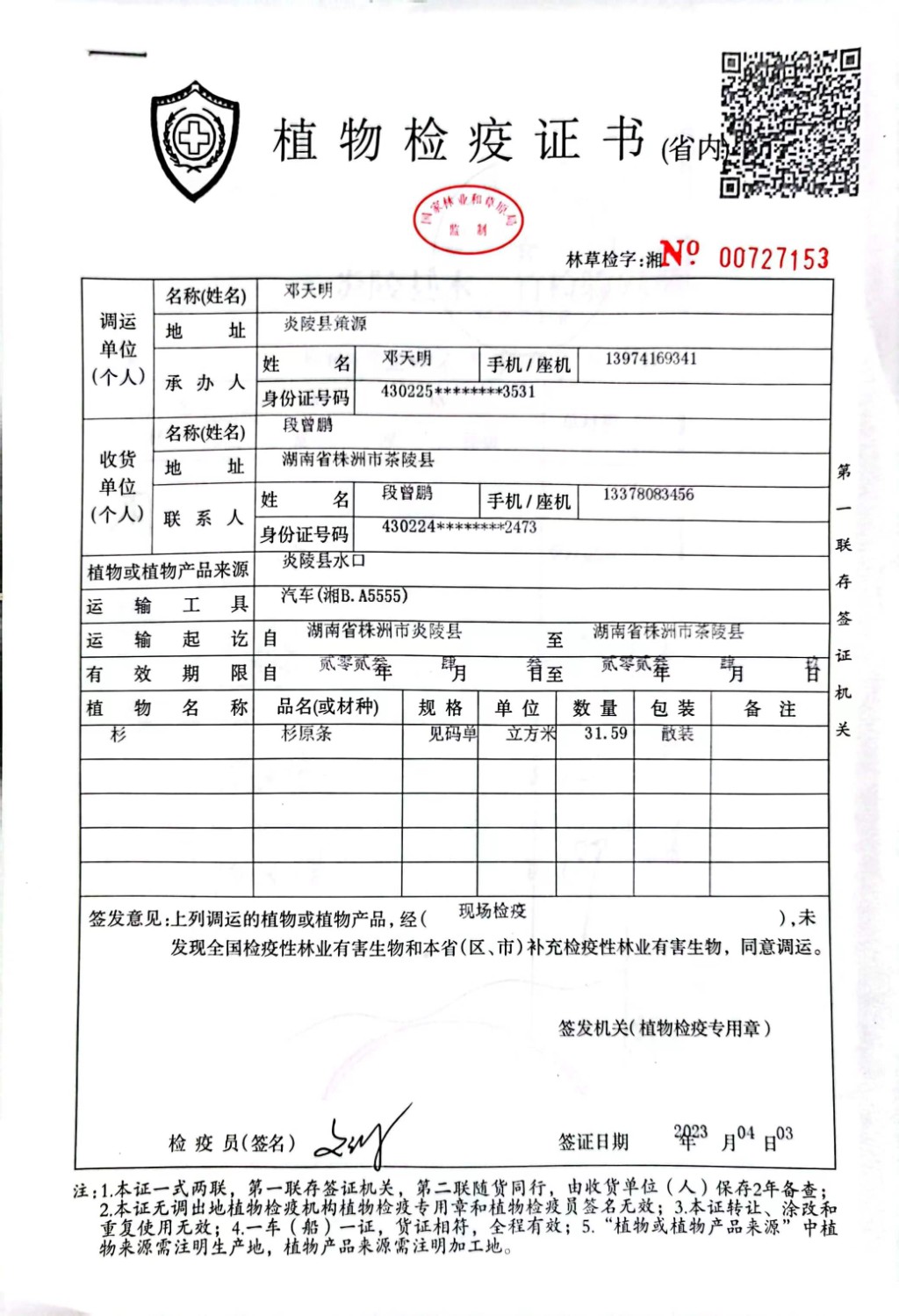 炎陵县林业局植物检疫证书林草检字:湘No 00727153