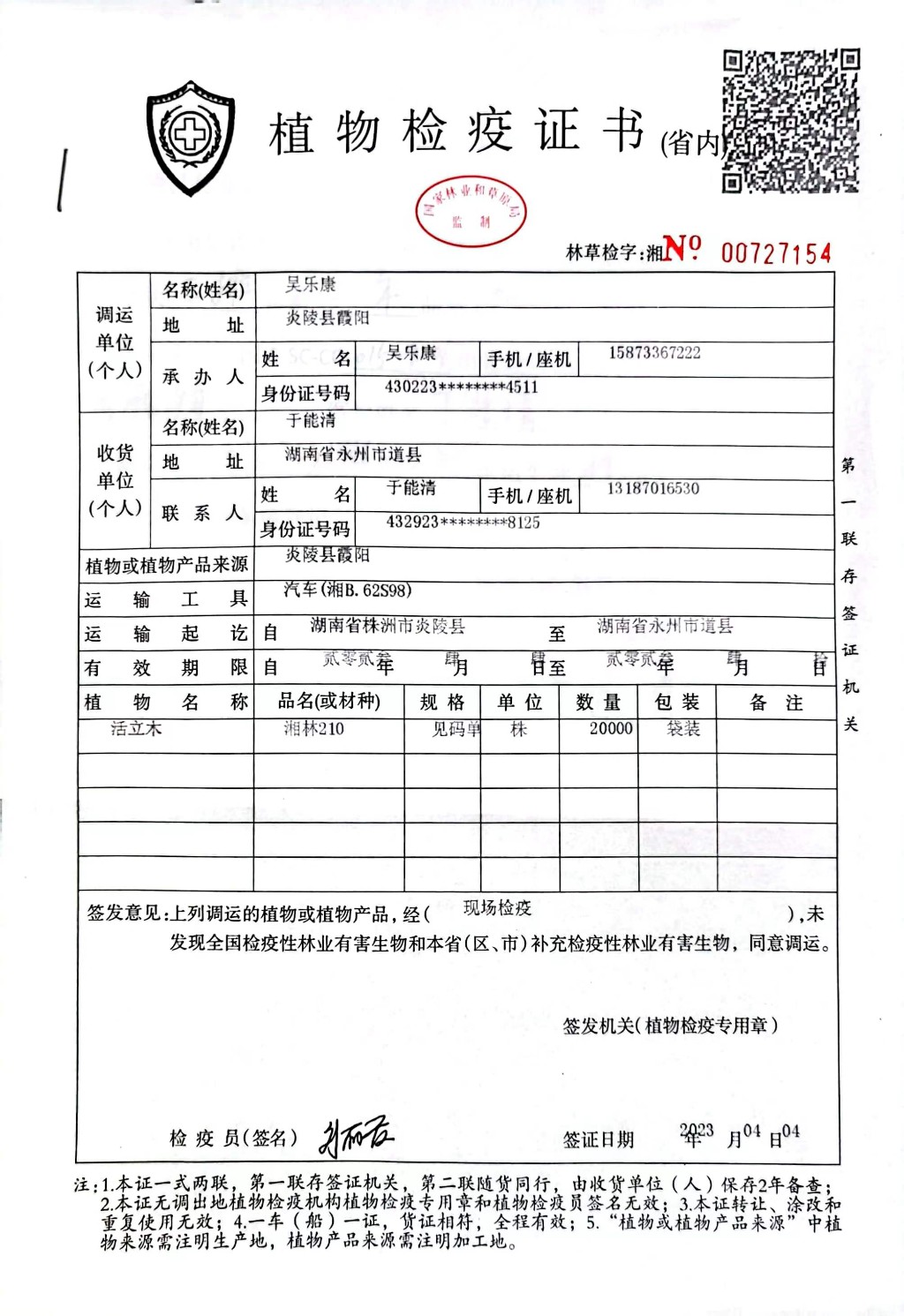 炎陵县林业局植物检疫证书林草检字:湘No 00727154
