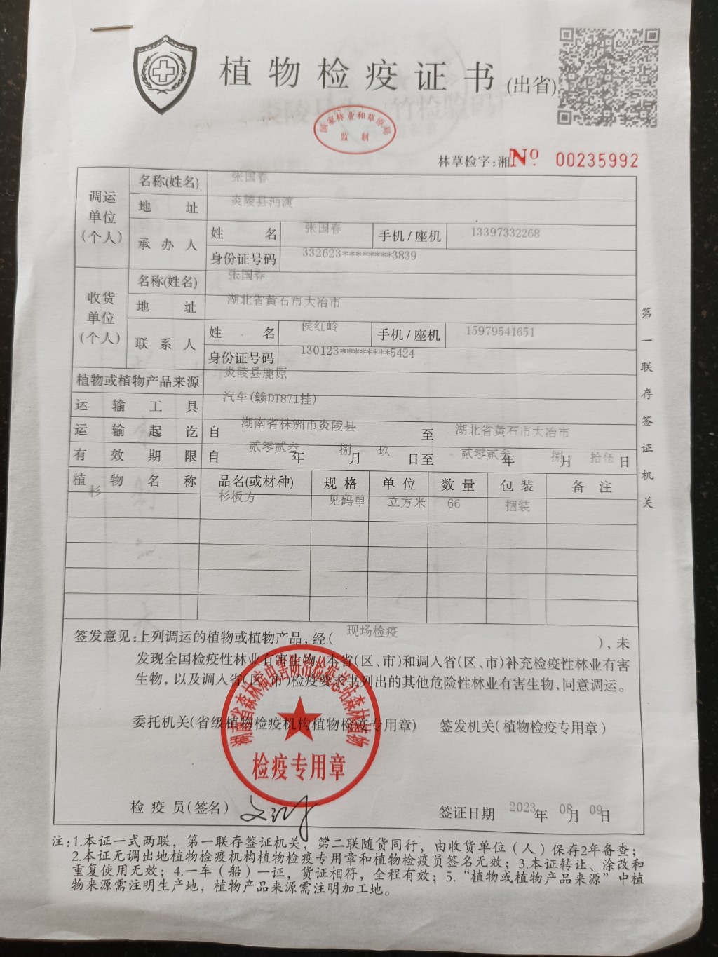 炎陵县林业局植物检疫证书林草检字:湘No 00235992