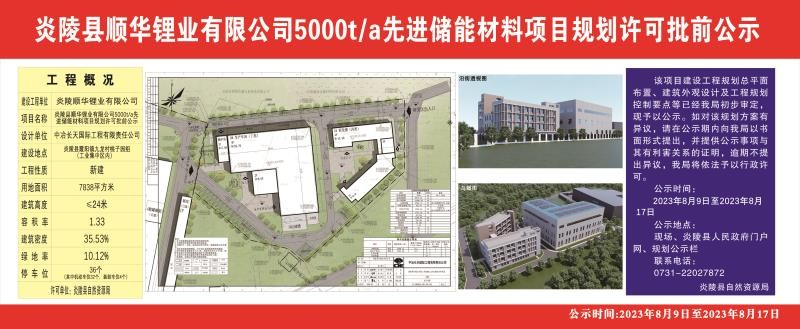 炎陵县顺华锂业有限公司5000t/a先进储能材料项目规划许可批前公示