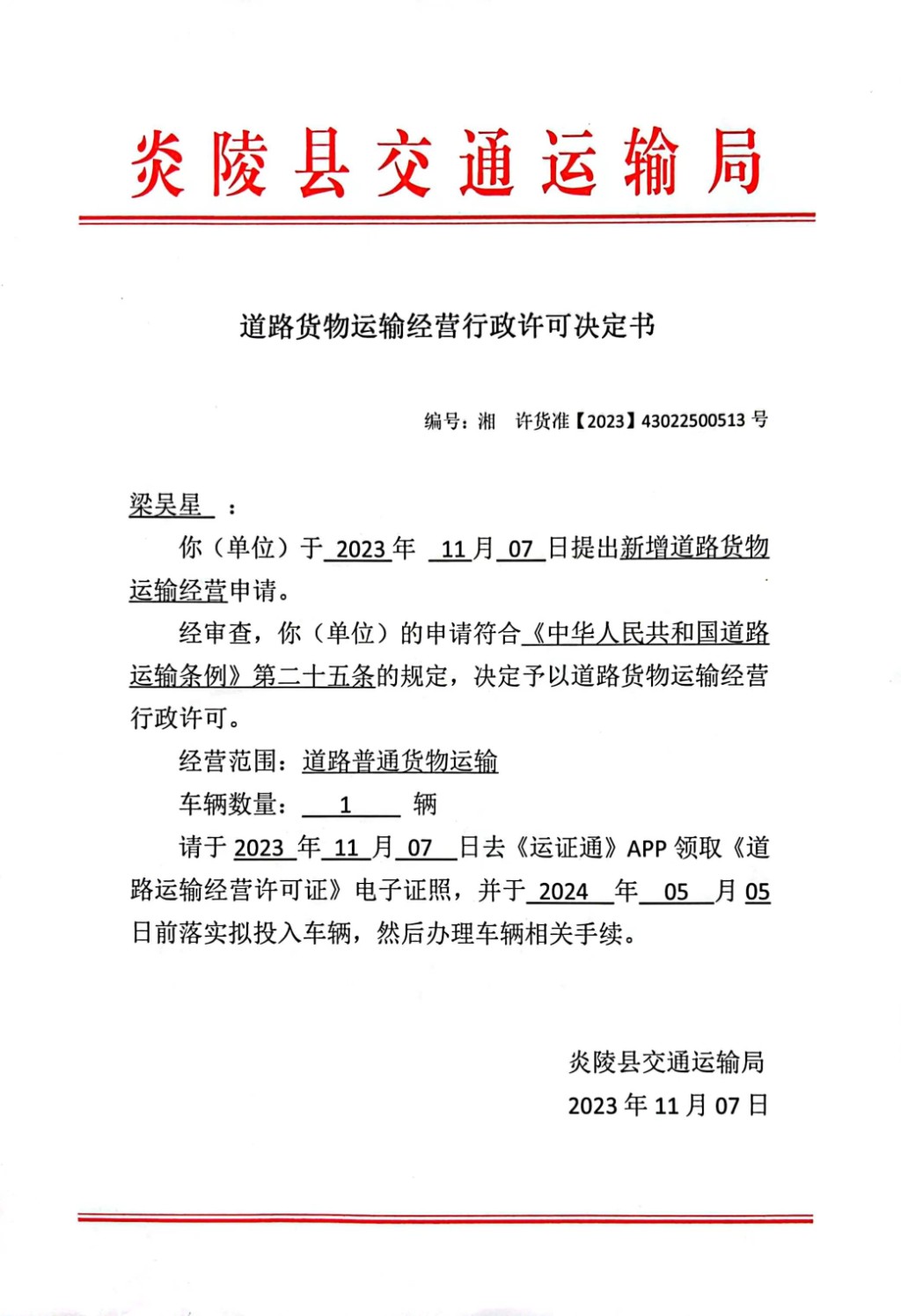 炎陵县交通运输局道路货物运输经营行政许可决定书(湘)许货准【2023】43022500513号
