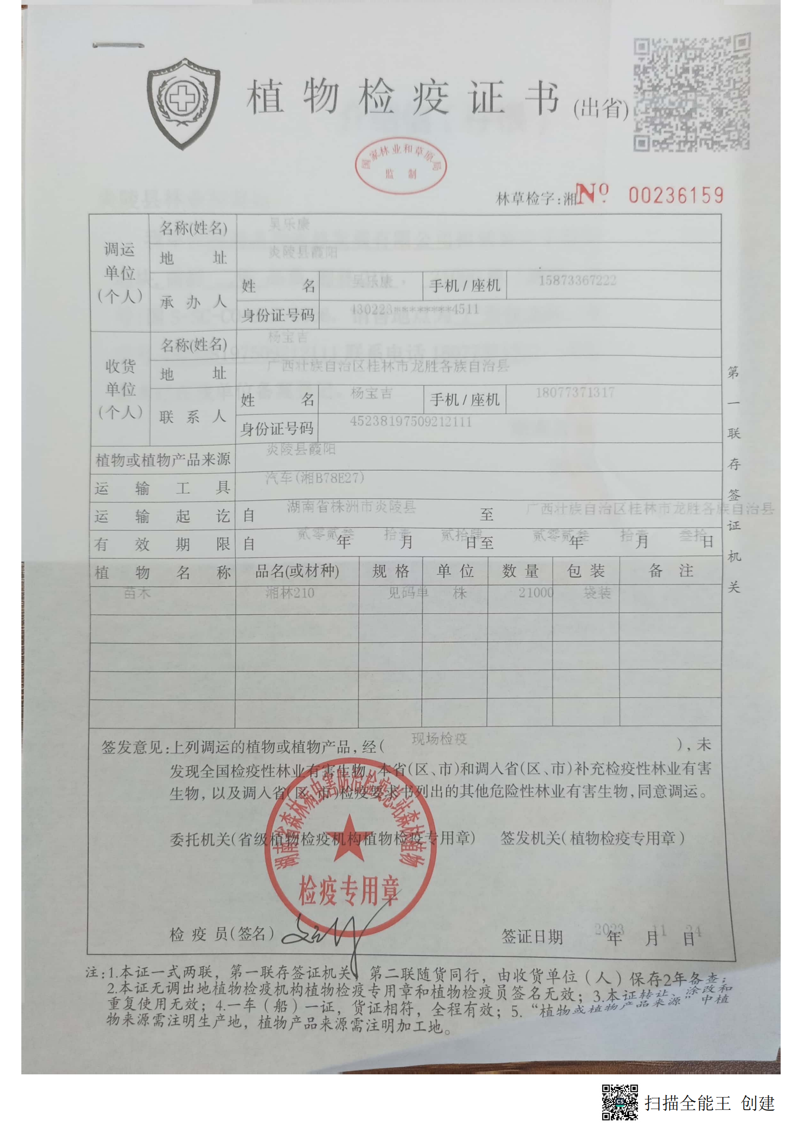 炎陵县林业局植物检疫证书林草检字:湘No 00236159