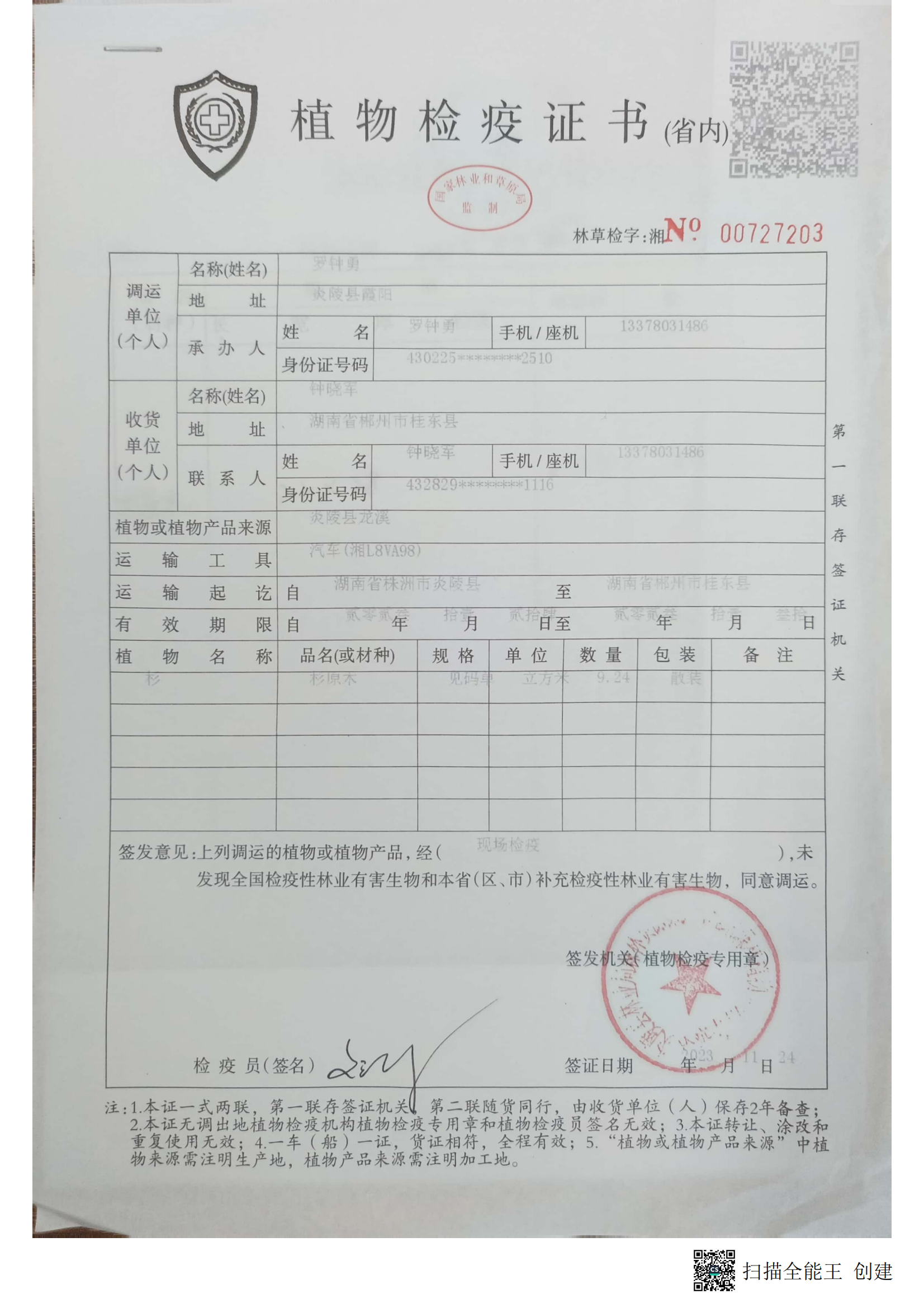 炎陵县林业局植物检疫证书林草检字:湘No 00727203