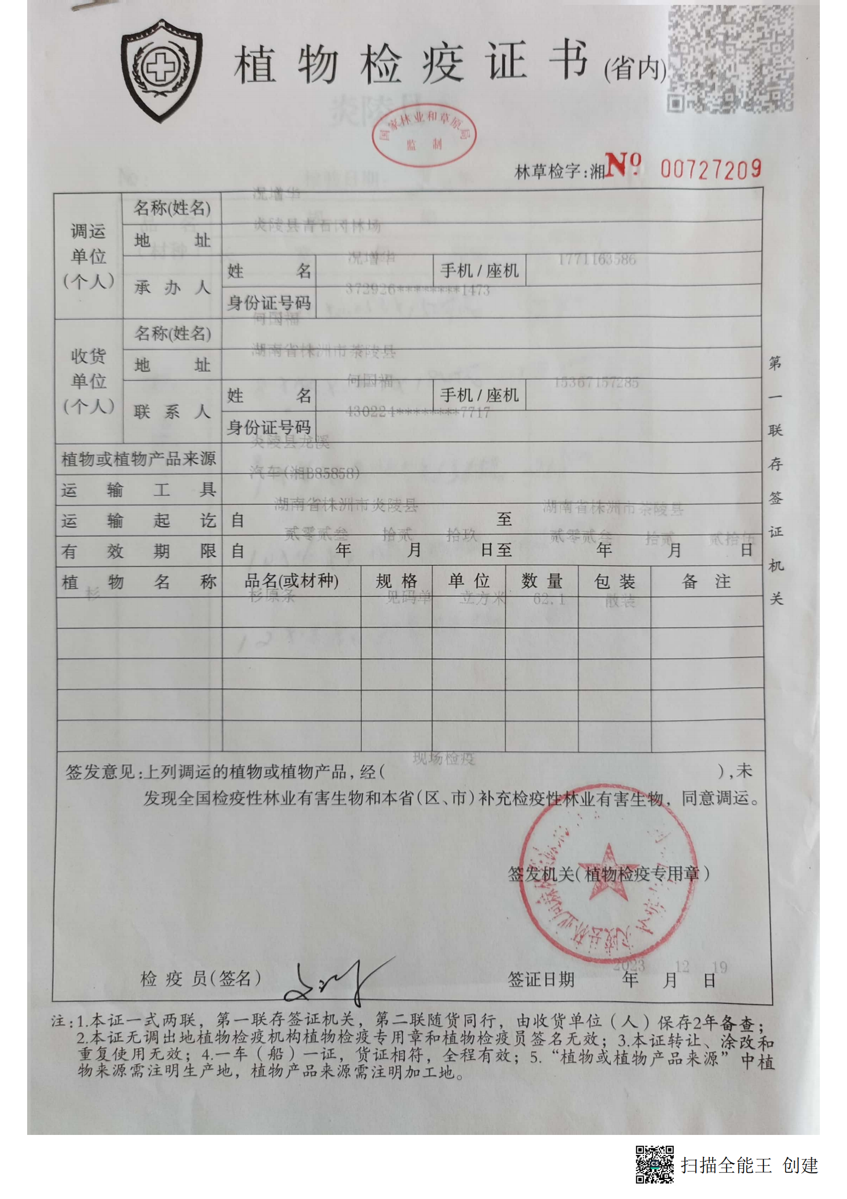 炎陵县林业局植物检疫证书林草检字:湘No 00727209