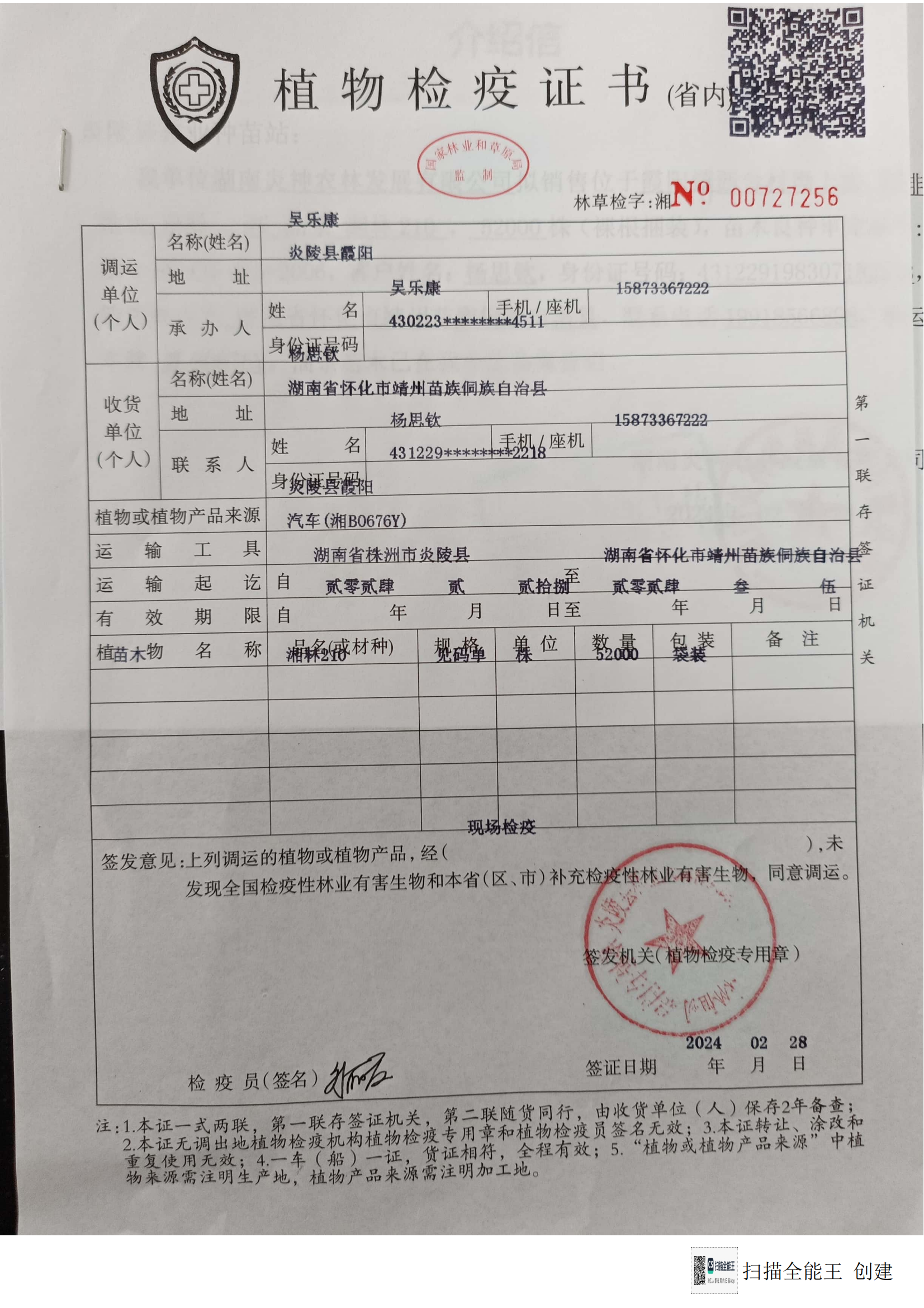 炎陵县林业局植物检疫证书林草检字:湘No 00727256