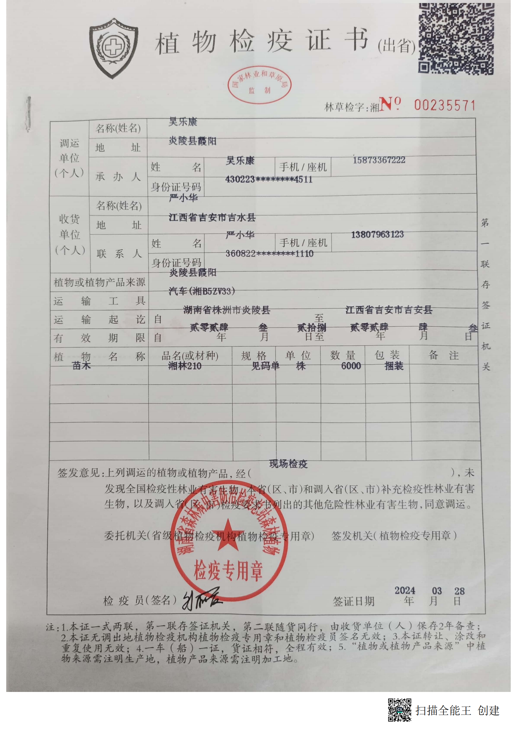 炎陵县林业局植物检疫证书林草检字:湘No 00235571