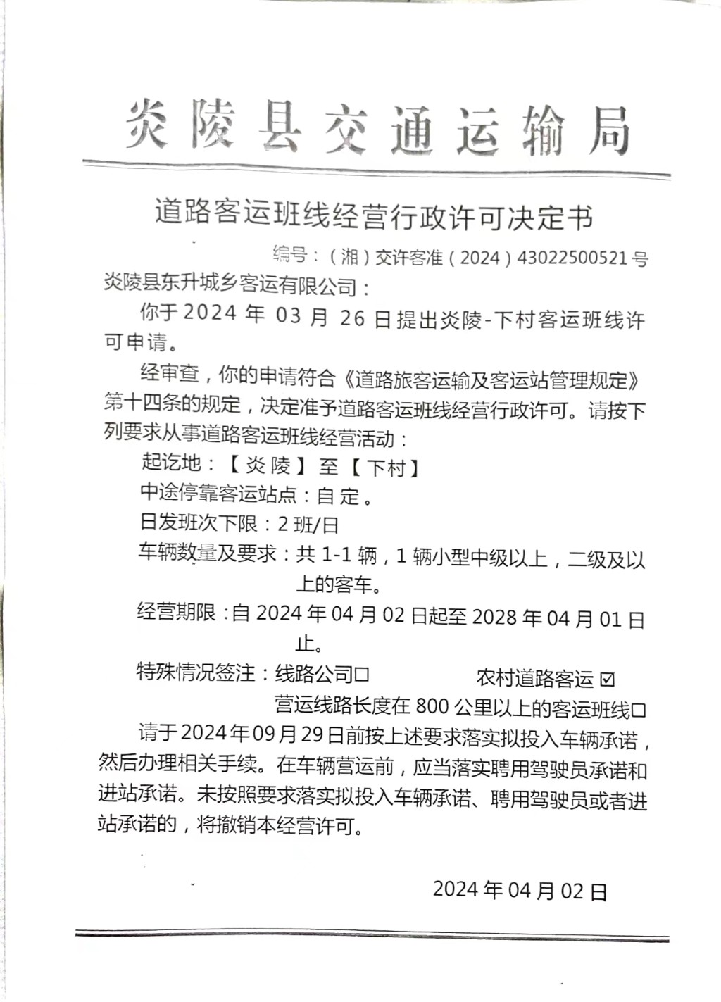 炎陵县交通运输局道路客运班车经营行政许可决定书(湘)交许客准〔2024〕43022500521号