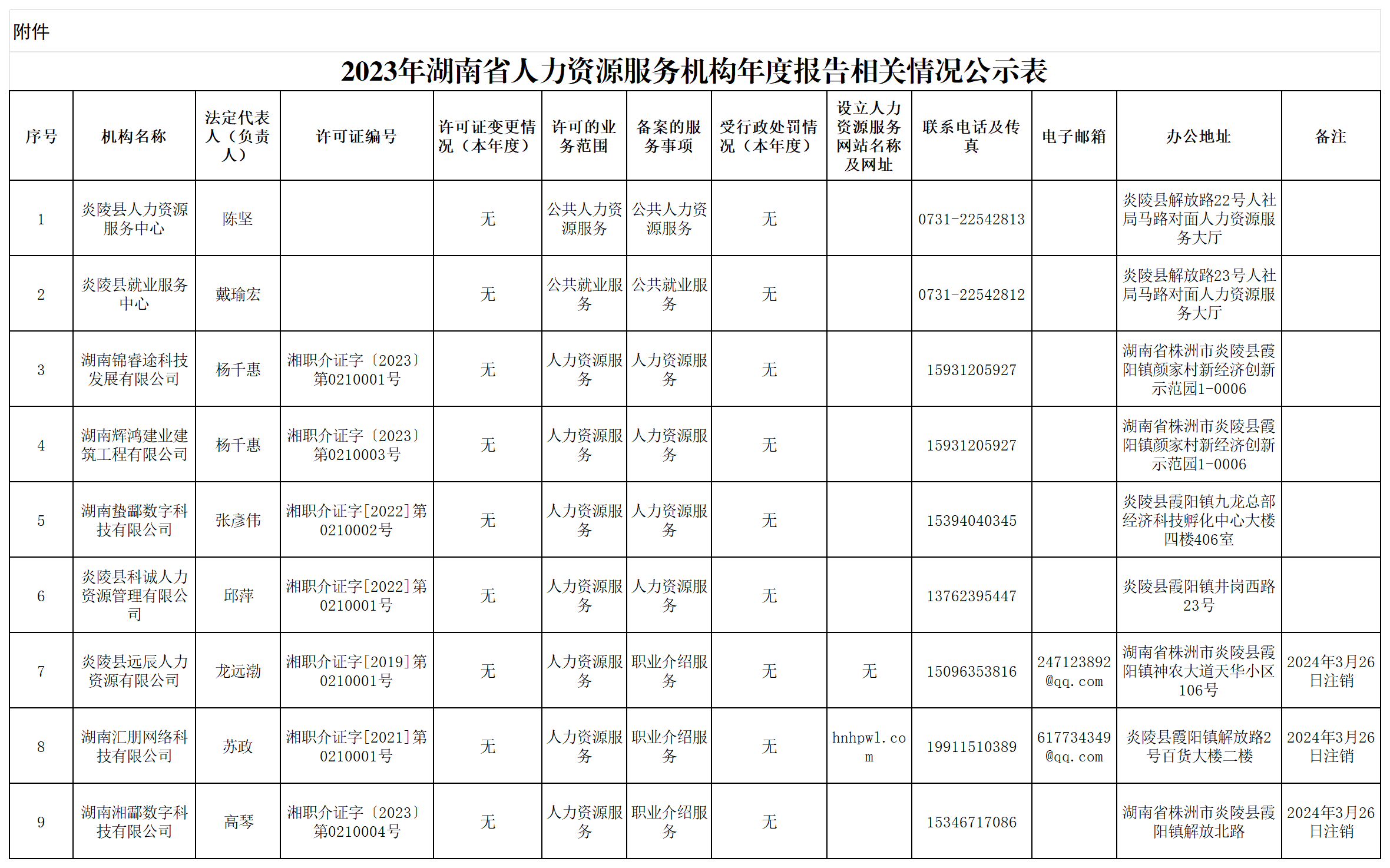 2023年度炎陵县辖区内有7家经营性人力资源服务机构其中4家正常经营分别是:湖南蛰酃数字科技有限公司、炎陵县科诚人力资源管理有限公司、湖南锦睿途科技发展有限公司、湖南辉鸿建业建筑工程有限公司,3家已经注销分别是:湖南汇朋网络科技有限公司、炎陵县远辰人力资源有限公司、湖南湘酃数字科技有限公司和2家公共人力资源服务机构分别是:炎陵县就业服务中心、炎陵县人力资源服务中心,于2024年4月30前自行完成2023年1月1日至2023年12月31日期间公示内容。