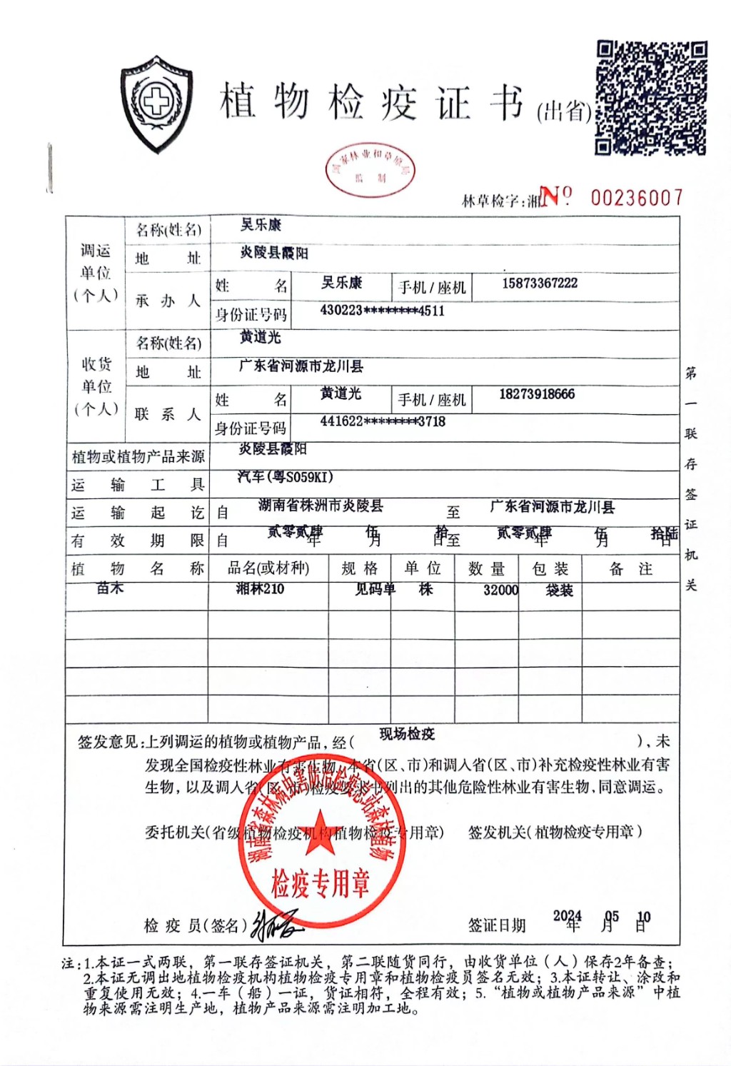 炎陵县林业局植物检疫证书林草检字:湘No 00236007