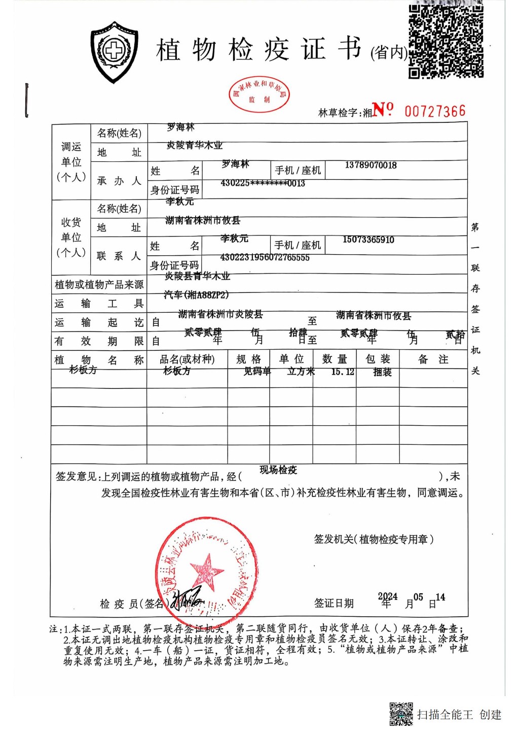 炎陵县林业局植物检疫证书林草检字:湘No 00727366