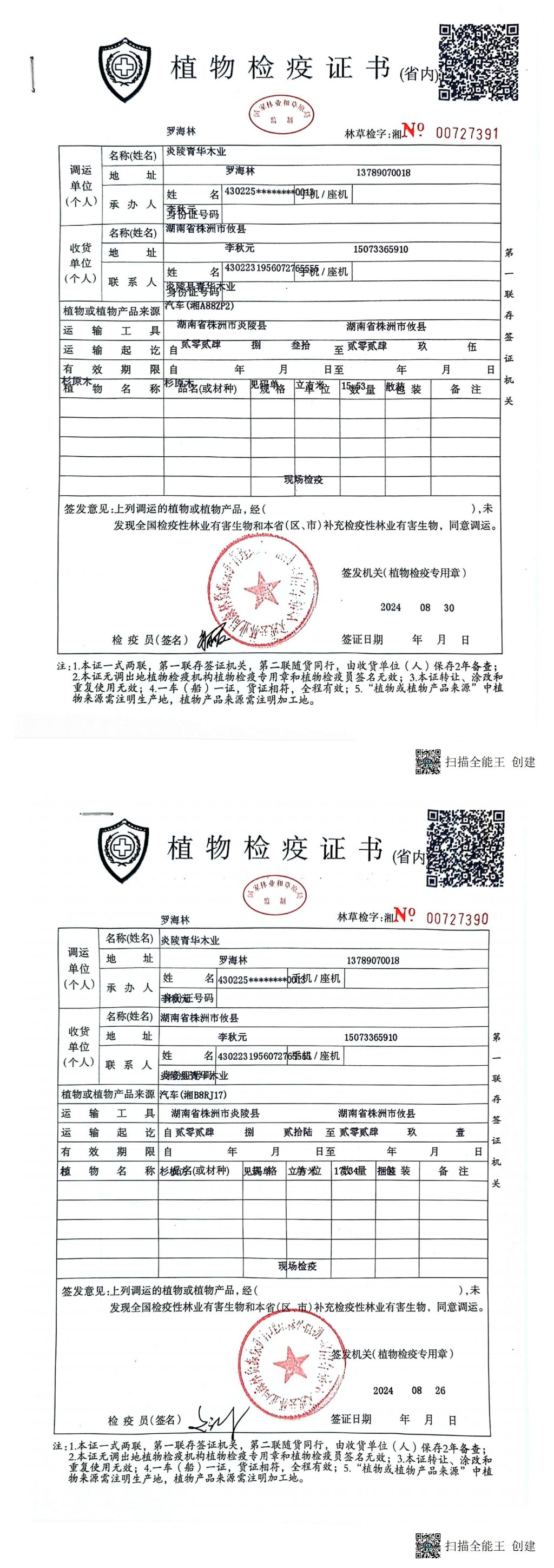 炎陵县林业局植物检疫证书林草检字:湘No 00727391