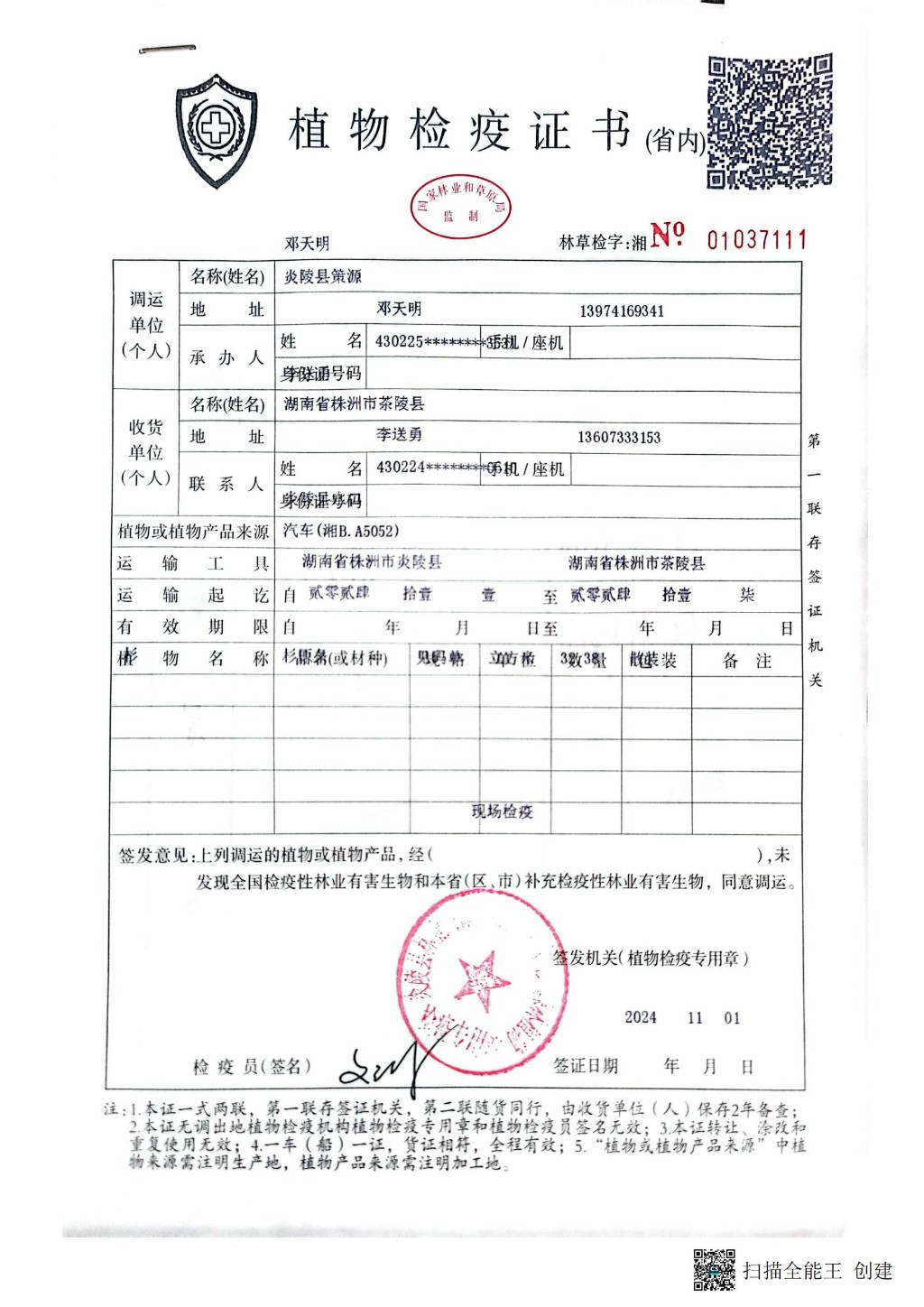 炎陵县林业局植物检疫证书林草检字:湘No 01037111
